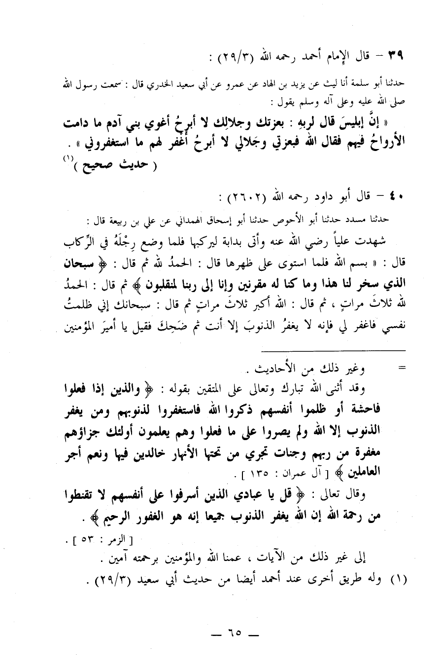 32- عَنْ أَبِي سَعِيدٍ الْخُدْرِيِّ (قَالَ: سَمِعْتُ رَسُولَ اللَّهِ صلى الله عليه وسلم يَقُولُ: ((إِنَّ إِبْلِيسَ قَالَ لِرَبِّهِ: بِعِزَّتِكَ وَجَلَالِكَ لَا أَبْرَحُ أُغْوِي بَنِي آدَمَ مَا دَامَتْ الْأَرْوَاحُ فِيهِمْ، فَقَالَ اللَّهُ: فَبِعِزَّتِي وَجَلَالِي لَا أَبْرَحُ أَغْفِرُ لَهُمْ مَا اسْتَغْفَرُونِي))