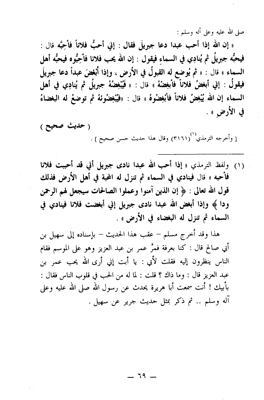 ((إِنَّ اللَّهَ إِذَا أَحَبَّ عَبْدًا دَعَا جِبْرِيلَ فَقَالَ: إِنِّي أُحِبُّ فُلَانًا فَأَحِبَّهُ)) . قَالَ: ((فَيُحِبُّهُ جِبْرِيلُ، ثُمَّ يُنَادِي فِي السَّمَاءِ فَيَقُولُ: إِنَّ اللَّهَ يُحِبُّ فُلَانًا فَأَحِبُّوهُ فَيُحِبُّهُ أَهْلُ السَّمَاءِ)) قَالَ: ((ثُمَّ يُوضَعُ لَهُ الْقَبُولُ فِي الْأَرْضِ، وَإِذَا أَبْغَضَ عَبْدًا دَعَا جِبْرِيلَ فَيَقُولُ: إِنِّي أُبْغِضُ فُلَانًا فَأَبْغِضْهُ)) قَالَ: ((فَيُبْغِضُهُ جِبْرِيلُ ثُمَّ يُنَادِي فِي أَهْلِ السَّمَاءِ إِنَّ اللَّهَ يُبْغِضُ فُلَانًا فَأَبْغِضُوهُ)) قَالَ: فَيُبْغِضُونَهُ ثُمَّ تُوضَعُ لَهُ الْبَغْضَاءُ فِي الْأَرْضِ)) .