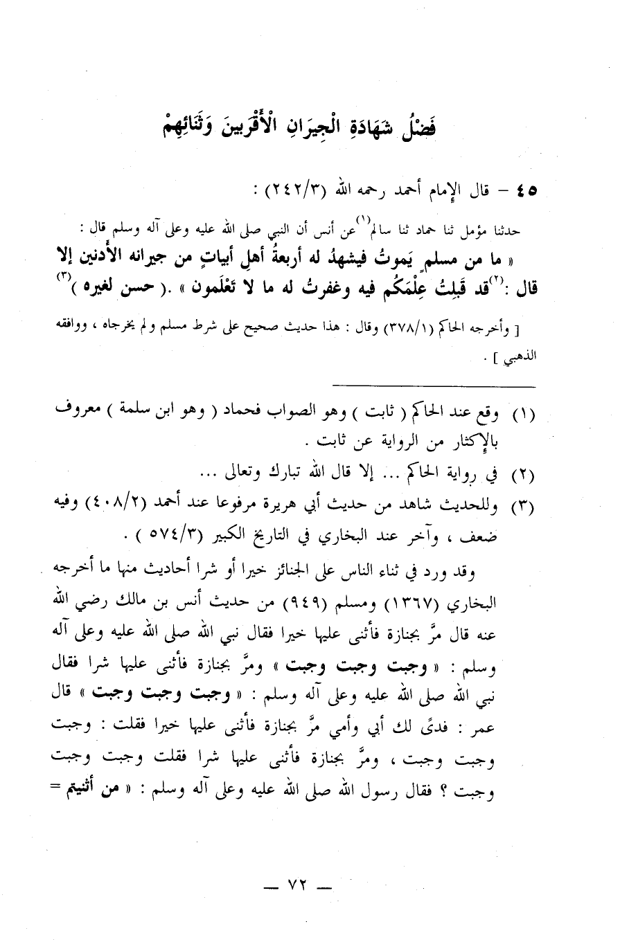 38- عَنْ أَنَسٍ (أَنَّ النَّبِيَّ صلى الله عليه وسلم قَالَ: ((مَا مِنْ مُسْلِمٍ يَمُوتُ فَيَشْهَدُ لَهُ أَرْبَعَةٌ أَهْلُ أَبْيَاتٍ مِنْ جِيرَانِهِ الْأَدْنَيْنَ إِلَّا قَالَ: قَدْ قَبِلْتُ فِيهِ عِلْمَكُمْ فِيهِ وَغَفَرْتُ لَهُ مَا لَا تَعْلَمُونَ))