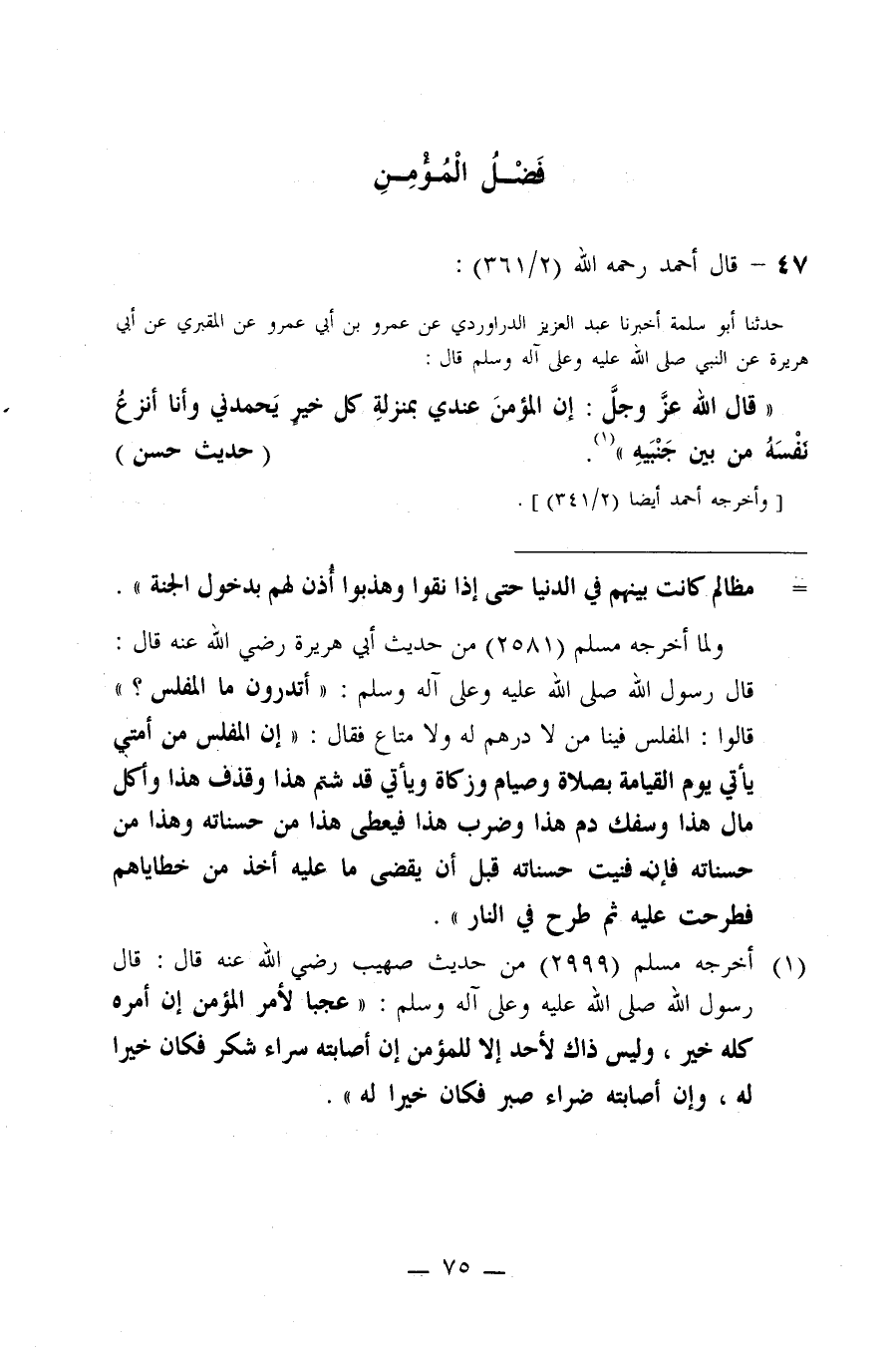 40- عَنْ أَبِي هُرَيْرَةَ (قَالَ: سَمِعْتُ رَسُولَ اللَّهِ صلى الله عليه وسلم يَقُولُ: ((إِنَّ اللَّهَ عَزَّ وَجَلَّ يَقُولُ: إِنَّ عَبْدِي الْمُؤْمِنَ عِنْدِي بِمَنْزِلَةِ كُلِّ خَيْرٍ يَحْمَدُنِي وَأَنَا أَنْزِعُ نَفْسَهُ مِنْ بَيْنِ جَنْبَيْهِ)) .