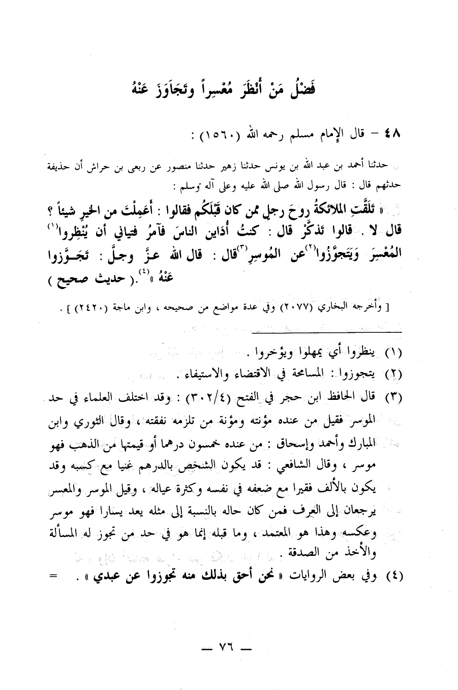41- عَنْ حُذَيْفَةَ (قَالَ: قَالَ رَسُولُ اللَّهِ صلى الله عليه وسلم: ((تَلَقَّتْ الْمَلَائِكَةُ رُوحَ رَجُلٍ مِمَّنْ كَانَ قَبْلَكُمْ فَقَالُوا: أَعَمِلْتَ مِنْ الْخَيْرِ شَيْئًا؟ قَالَ: لَا، قَالُوا: تَذَكَّرْ. قَالَ: كُنْتُ أُدَايِنُ النَّاسَ فَآمُرُ فِتْيَانِي أَنْ يُنْظِرُوا الْمُعْسِرَ وَيَتَجَوَّزُوا عَنْ الْمُوسِرِ قَالَ: قَالَ اللَّهُ عَزَّ وَجَلّ: َ تَجَوَّزُوا عَنْهُ)) .
