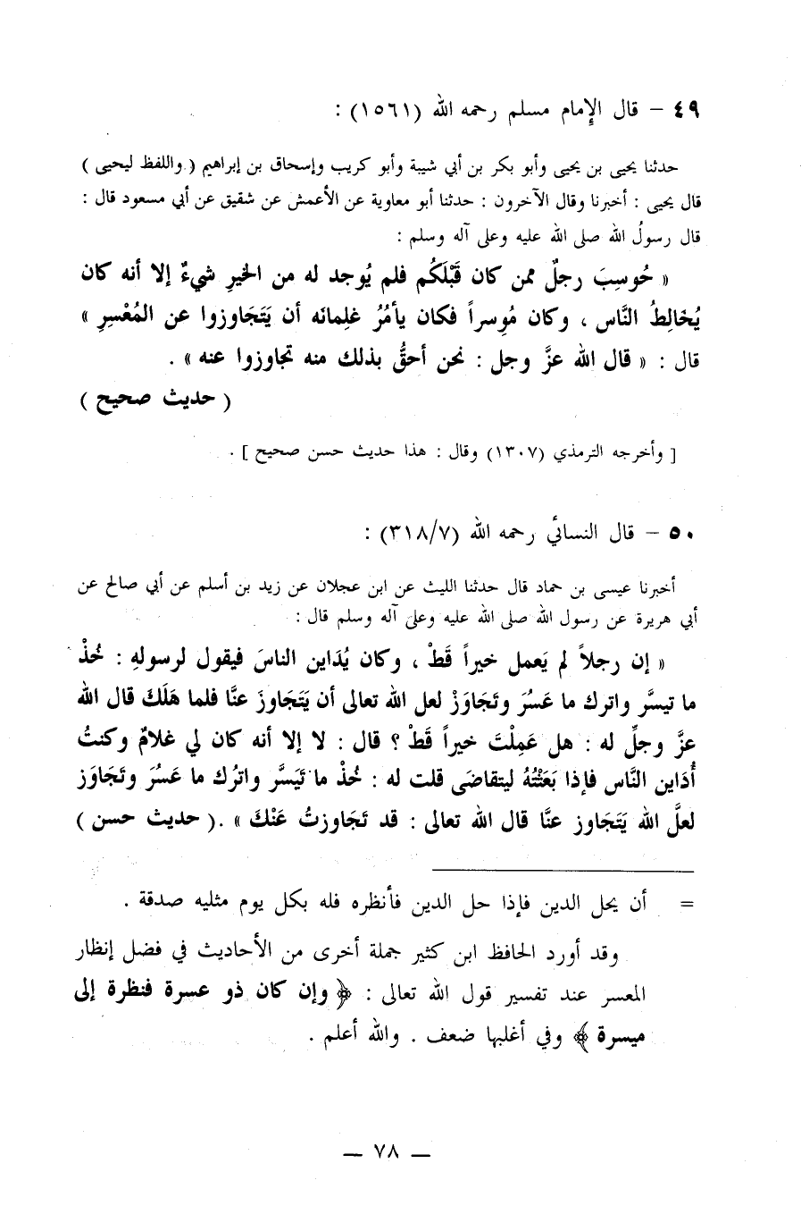 43- عَنْ أَبِي هُرَيْرَةَ (: عَنْ رَسُولِ اللَّهِ صلى الله عليه وسلم قَالَ: ((إِنَّ رَجُلاً لَمْ يَعْمَلْ خَيْرًا قَطُّ، وَكَانَ يُدَايِنُ النَّاسَ فَيَقُولُ لِرَسُولِه: ِ خُذْ مَا تَيَسَّرَ وَاتْرُكْ مَا عَسُرَ وَتَجَاوَزْ، لَعَلَّ اللَّهَ تَعَالَى أَنْ يَتَجَاوَزَ عَنَّا، فَلَمَّا هَلَكَ قَالَ اللَّهُ عَزَّ وَجَلَّ لَهُ: هَلْ عَمِلْتَ خَيْرًا قَطُّ؟ قَالَ: لَا إِلَّا أَنَّهُ كَانَ لِي غُلَامٌ وَكُنْتُ أُدَايِنُ النَّاسَ فَإِذَا بَعَثْتُهُ لِيَتَقَاضَى قُلْتُ لَهُ: خُذْ مَا تَيَسَّرَ وَاتْرُكْ مَا عَسُرَ وَتَجَاوَزْ لَعَلَّ اللَّهَ يَتَجَاوَزُ عَنَّا، قَالَ اللَّهُ تَعَالَى: قَدْ تَجَاوَزْتُ عَنْكَ)) .