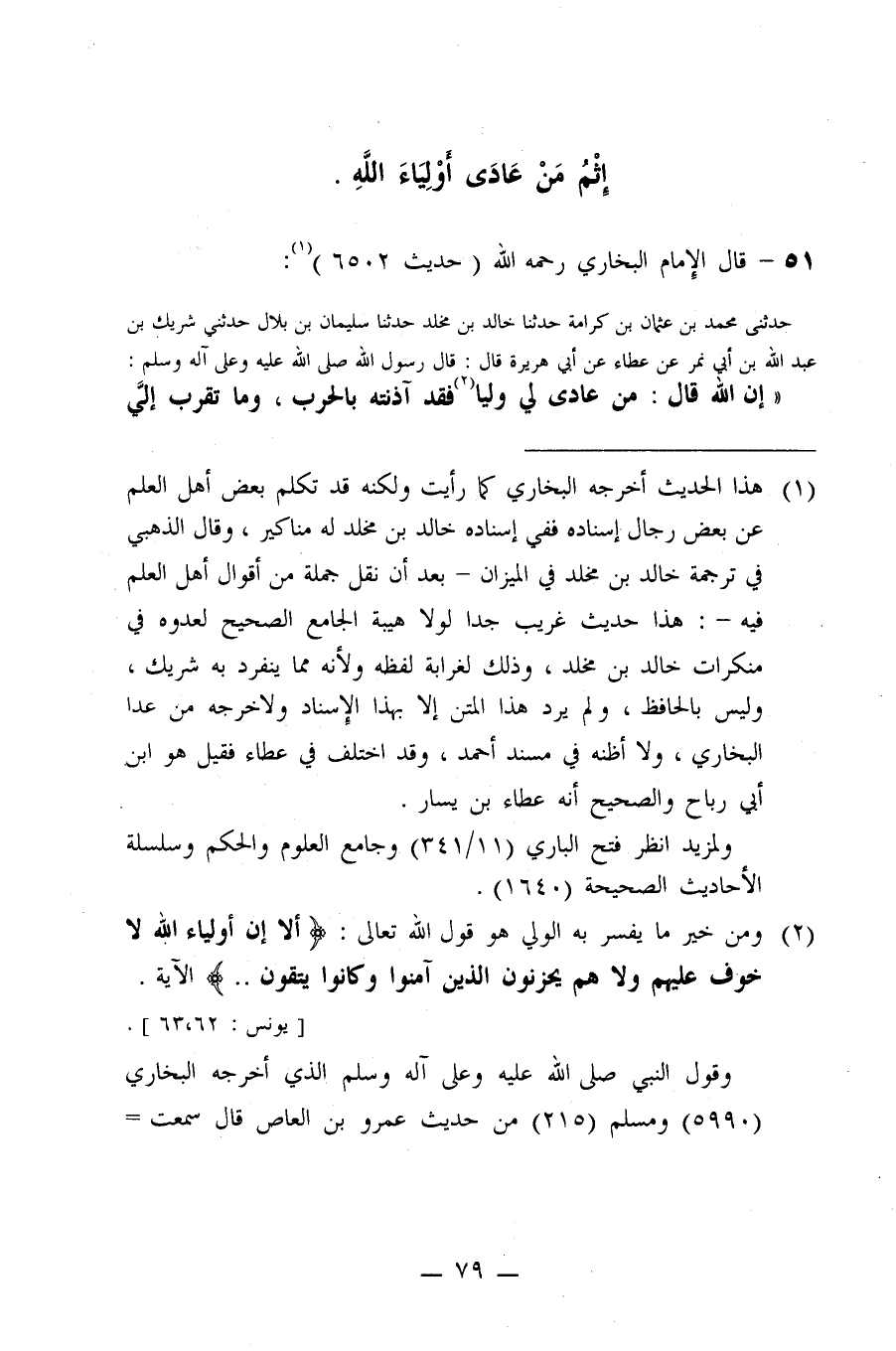 44- عَنْ أَبِي هُرَيْرَةَ (قَال: َ قَالَ رَسُولُ اللَّهِ صلى الله عليه وسلم: ((إِنَّ اللَّهَ قَالَ: مَنْ عَادَى لِي وَلِيًّا فَقَدْ آذَنْتُهُ بِالْحَرْب، ِ وَمَا تَقَرَّبَ إِلَيَّ