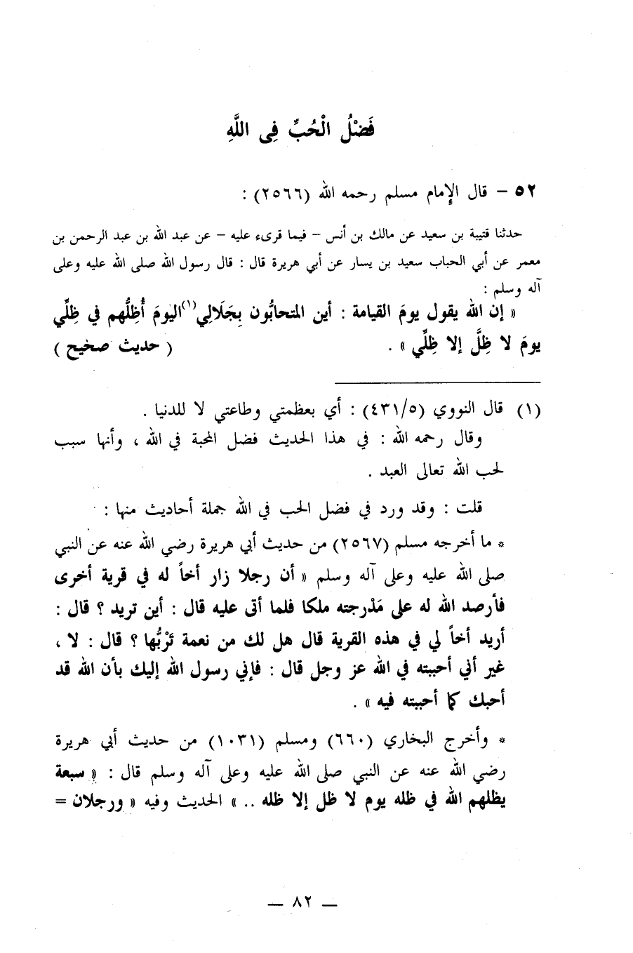 45- عَنْ أَبِي هُرَيْرَةَ (قَالَ: قَالَ رَسُولُ اللَّهِ صلى الله عليه وسلم: ((إِنَّ اللَّهَ يَقُولُ يَوْمَ الْقِيَامَةِ: أَيْنَ الْمُتَحَابُّونَ بِجَلَالِي الْيَوْمَ أُظِلُّهُمْ فِي ظِلِّي يَوْمَ لَا ظِلَّ إِلَّا ظِلِّي)) .