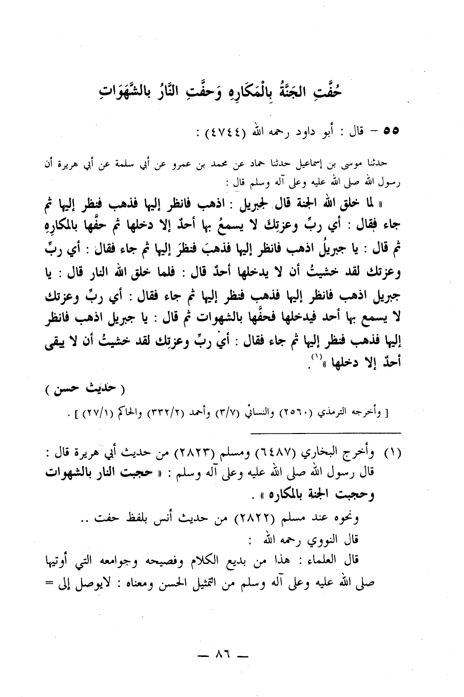 48- عَنْ أَبِي هُرَيْرَةَ (أَنَّ رَسُولَ اللَّهِ صلى الله عليه وسلم قَالَ: ((لَمَّا خَلَقَ اللَّهُ الْجَنَّةَ قَالَ لِجِبْرِيلَ: اذْهَبْ فَانْظُرْ إِلَيْهَا. فَذَهَبَ فَنَظَرَ إِلَيْهَا ثُمَّ جَاءَ فَقَالَ: أَيْ رَبِّ وَعِزَّتِكَ لَا يَسْمَعُ بِهَا أَحَدٌ إِلَّا دَخَلَهَا، ثُمَّ حَفَّهَا بِالْمَكَارِهِ ثُمَّ قَالَ: يَا جِبْرِيلُ اذْهَبْ فَانْظُرْ إِلَيْهَا، فَذَهَبَ فَنَظَرَ إِلَيْهَا، ثُمَّ جَاءَ، فَقَالَ: أَيْ رَبِّ وَعِزَّتِكَ لَقَدْ خَشِيتُ أَنْ لَا يَدْخُلَهَا أَحَدٌ، قَال: َ فَلَمَّا خَلَقَ اللَّهُ النَّارَ قَالَ يَا جِبْرِيلُ اذْهَبْ فَانْظُرْ إِلَيْهَا فَذَهَبَ فَنَظَرَ إِلَيْهَا، ثُمَّ جَاءَ فَقَالَ: أَيْ رَبِّ وَعِزَّتِكَ لَا يَسْمَعُ بِهَا أَحَدٌ فَيَدْخُلُهَا، فَحَفَّهَا بِالشَّهَوَاتِ ثُمَّ قَالَ: يَا جِبْرِيلُ اذْهَبْ فَانْظُرْ إِلَيْهَا فَذَهَبَ فَنَظَرَ إِلَيْهَا ثُمَّ جَاءَ فَقَالَ: أَيْ رَبِّ وَعِزَّتِكَ لَقَدْ خَشِيتُ أَنْ لَا يَبْقَى أَحَدٌ إِلَّا دَخَلَهَا)) .