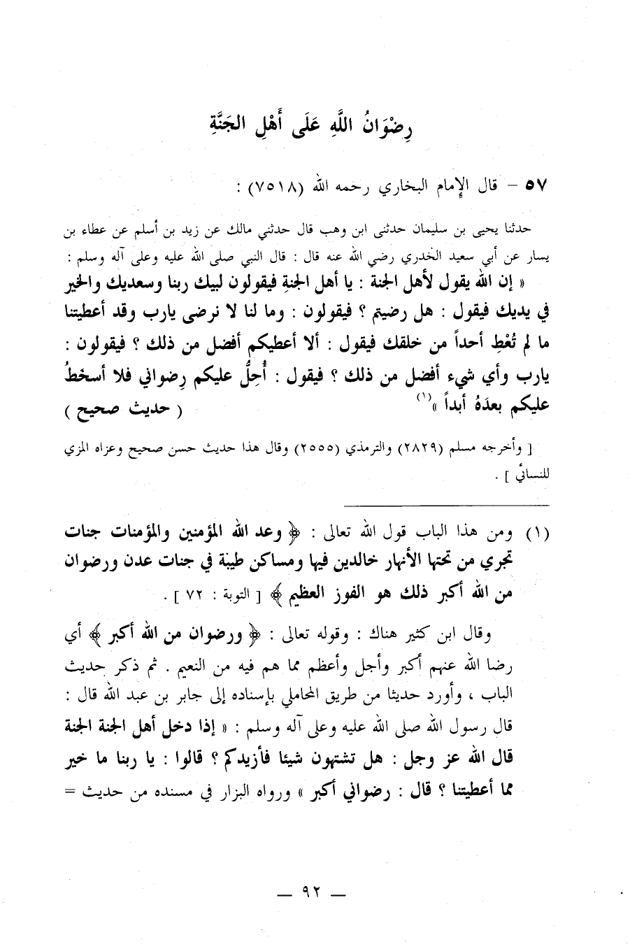 50- عَنْ أَبِي سَعِيدٍ الْخُدْرِيِّ (قَالَ: قَالَ النَّبِيُّ صلى الله عليه وسلم: ((إِنَّ اللَّهَ يَقُولُ لِأَهْلِ الْجَنَّةِ: يَا أَهْلَ الْجَنَّةِ، فَيَقُولُونَ: لَبَّيْكَ رَبَّنَا وَسَعْدَيْكَ وَالْخَيْرُ فِي يَدَيْك، َ فَيَقُولُ: هَلْ رَضِيتُمْ؟ فَيَقُولُونَ: وَمَا لَنَا لَا نَرْضَى يَا رَبِّ، وَقَدْ أَعْطَيْتَنَا مَا لَمْ تُعْطِ أَحَدًا مِنْ خَلْقِكَ، فَيَقُولُ أَلَا أُعْطِيكُمْ أَفْضَلَ مِنْ ذَلِكَ؟ فَيَقُولُونَ: يَا رَبِّ وَأَيُّ شَيْءٍ أَفْضَلُ مِنْ ذَلِكَ؟ فَيَقُولُ: أُحِلُّ عَلَيْكُمْ رِضْوَانِي فَلَا أَسْخَطُ عَلَيْكُمْ بَعْدَهُ أَبَدًا)) .