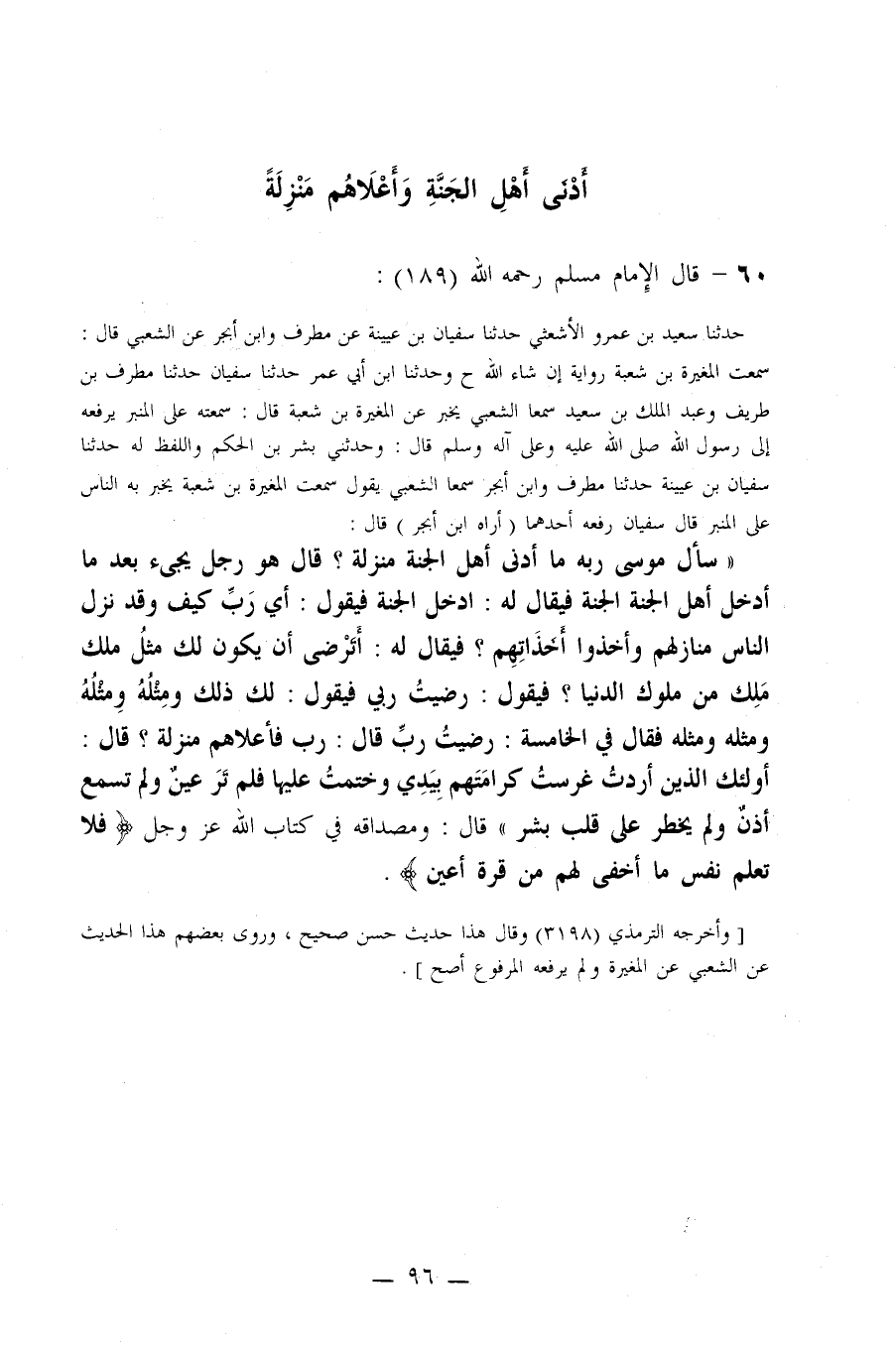 53- عَنْ الْمُغِيرَةَ بْنَ شُعْبَةَ َرْفَعُهُ إِلَى (¬1) رَسُولِ اللَّهِ صلى الله عليه وسلم قَالَ: ((سَأَلَ مُوسَى رَبَّهُ مَا أَدْنَى أَهْلِ الْجَنَّةِ مَنْزِلَةً؟ قَالَ: هُوَ رَجُلٌ يَجِيءُ بَعْدَ مَا أُدْخِلَ أَهْلُ الْجَنَّةِ الْجَنَّةَ فَيُقَالُ لَهُ: ادْخُلْ الْجَنَّةَ فَيَقُولُ: أَيْ رَبِّ كَيْفَ وَقَدْ نَزَلَ النَّاسُ مَنَازِلَهُمْ وَأَخَذُوا أَخَذَاتِهِمْ؟ فَيُقَالُ لَهُ: أَتَرْضَى أَنْ يَكُونَ لَكَ مِثْلُ مُلْكِ مَلِكٍ مِنْ مُلُوكِ الدُّنْيَا؟ فَيَقُولُ: رَضِيتُ رَبِّ، فَيَقُولُ لَكَ ذَلِكَ وَمِثْلُهُ وَمِثْلُهُ وَمِثْلُهُ وَمِثْلُهُ فَقَالَ فِي الْخَامِسَة: ِ رَضِيتُ رَبِّ، قَالَ: رَبِّ فَأَعْلَاهُمْ مَنْزِلَةً؟ قَالَ: أُولَئِكَ الَّذِينَ أَرَدْتُ غَرَسْتُ كَرَامَتَهُمْ بِيَدِي وَخَتَمْتُ عَلَيْهَا فَلَمْ تَرَ عَيْنٌ وَلَمْ تَسْمَعْ أُذُنٌ وَلَمْ يَخْطُرْ عَلَى قَلْبِ بَشَر)) قَالَ: وَمِصْدَاقُهُ فِي كِتَابِ اللَّهِ عَزَّ وَجَلَّ: (فَلَا تَعْلَمُ نَفْسٌ مَا أُخْفِيَ لَهُمْ مِنْ قُرَّةِ أَعْيُنٍ (.