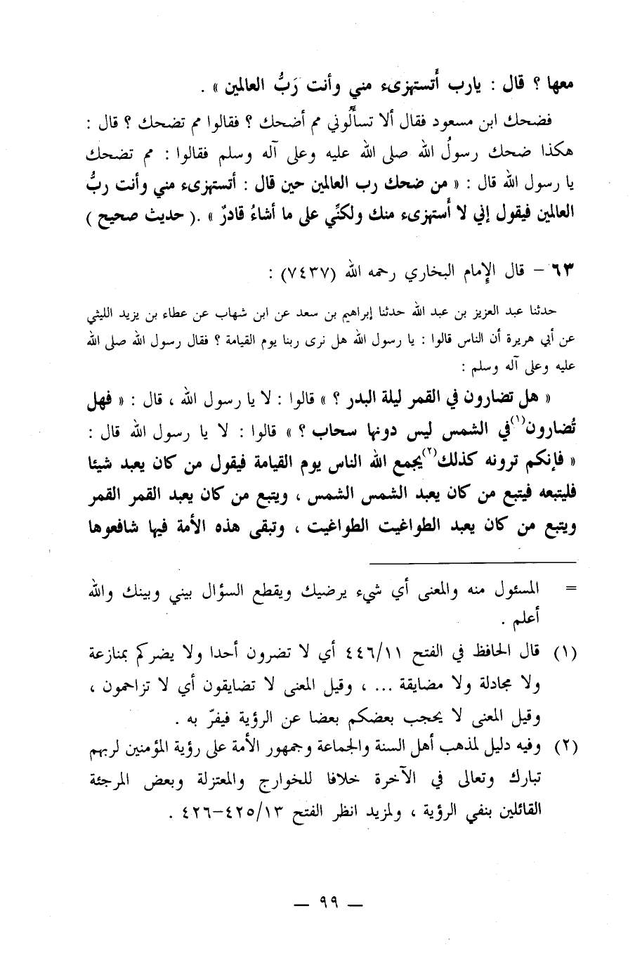 مَعَهَا؟ قَالَ يَا رَبِّ أَتَسْتَهْزِئُ مِنِّي وَأَنْتَ رَبُّ الْعَالَمِينَ؟)) فضَحِكَ ابْنُ مَسْعُودٍ فَقَالَ: أَلَا تَسْأَلُونِي مِمَّ أَضْحَكُ؟ فَقَالُوا: مِمَّ تَضْحَكُ؟ قَالَ: هَكَذَا ضَحِكَ رَسُولُ اللَّهِ صلى الله عليه وسلم , فَقَالُوا: مِمَّ تَضْحَكُ يَا رَسُولَ اللَّهِ؟ قَالَ: ((مِنْ ضِحْكِ رَبِّ الْعَالَمِينَ حِينَ قَالَ: أَتَسْتَهْزِئُ مِنِّي وَأَنْتَ رَبُّ الْعَالَمِينَ؟ فَيَقُولُ: إِنِّي لَا أَسْتَهْزِئُ مِنْكَ وَلَكِنِّي عَلَى مَا أَشَاءُ قَادِرٌ)) .