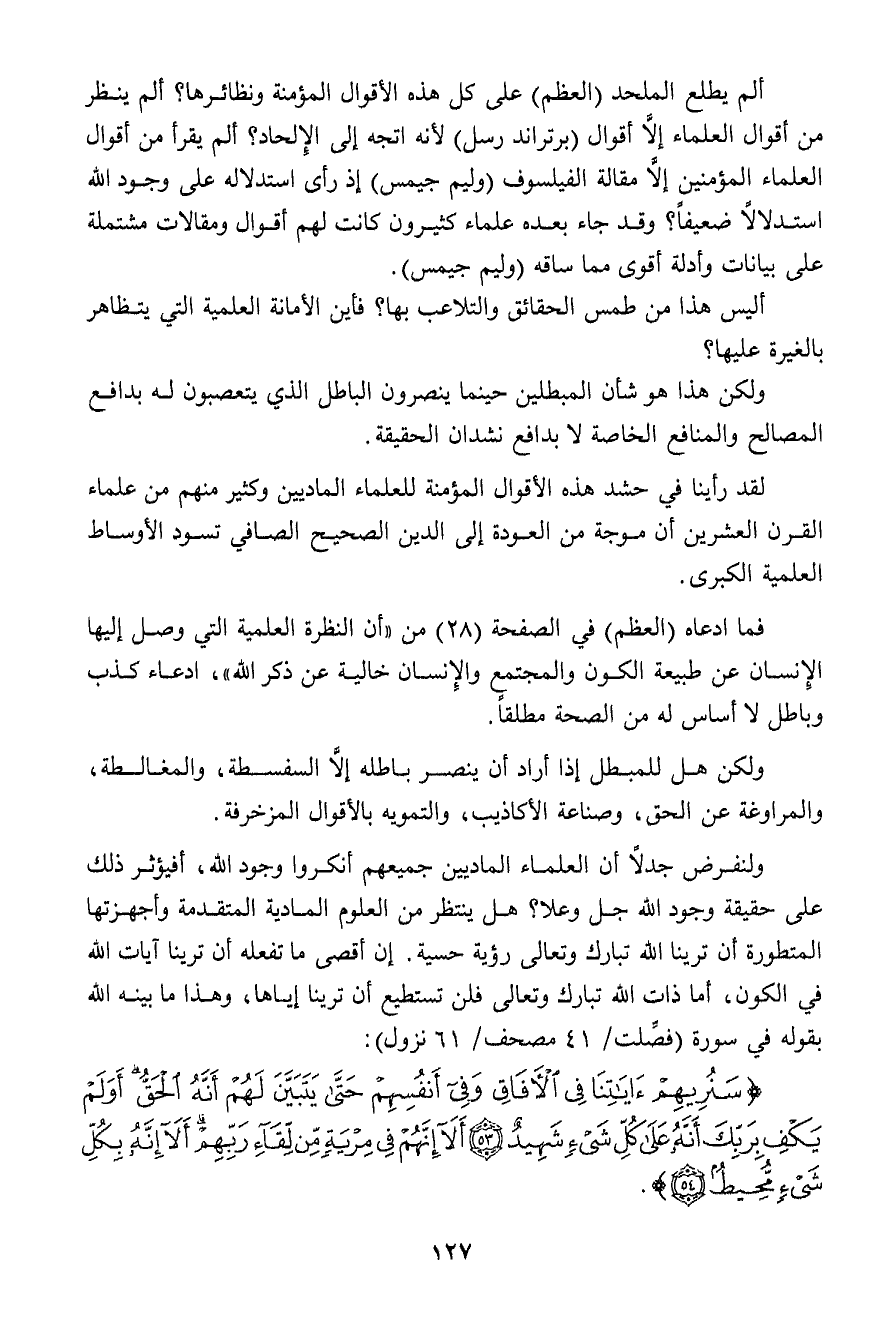 ألم يطلع الملحد (العظم) على كل هذه الأقوال المؤمنة ونظائرها؟ ألم ينظر من أقوال العلماء إلا أقوال (برتراند رسل) لأنه اتجه إلى الإلحاد؟ ألم يقرأ من أقوال العلماء المؤمنين إلا مقالة الفيلسوف (وليم جيمس) إذ رأى استدلاله على وجود الله استدلالاً ضعيفاً؟ وقد جاء بعده علماء كثيرون كانت لهم أقوال ومقالات مشتملة على بيانات وأدلة أقوى مما ساقه (وليم جيمس) .