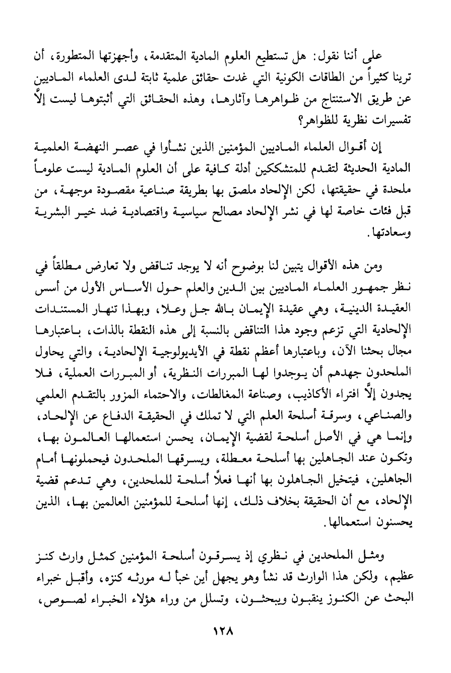 إن أقوال العلماء الماديين المؤمنين الذين نشأوا في عصر النهضة العلمية المادية الحديثة لتقدم للمتشككين أدلة كافية على أن العلوم المادية ليست علوماً ملحدة في حقيقتها، لكن الإلحاد ملصق بها بطريقة صناعية مقصودة موجهة، من قبل فئات خاصة لها في نشر الإلحاد مصالح سياسية واقتصادية ضد خيرية البشرية وسعادتها.