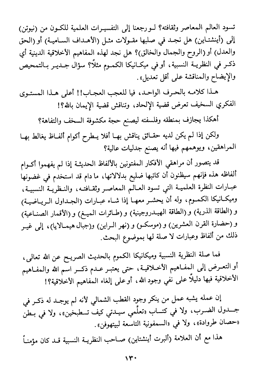 فما صلة النظرية النسبية وميكانيكا الكموم بالحديث الصريح عن الله تعالى، أو التعرض إلى المفاهيم الأخلاقية، حتى يعتبر عدم ذكر اسم الله والمفاهيم الأخلاقية فيها دليلاً على نفي وجود الله، أو على إلغاء المفاهيم الأخلاقية؟!