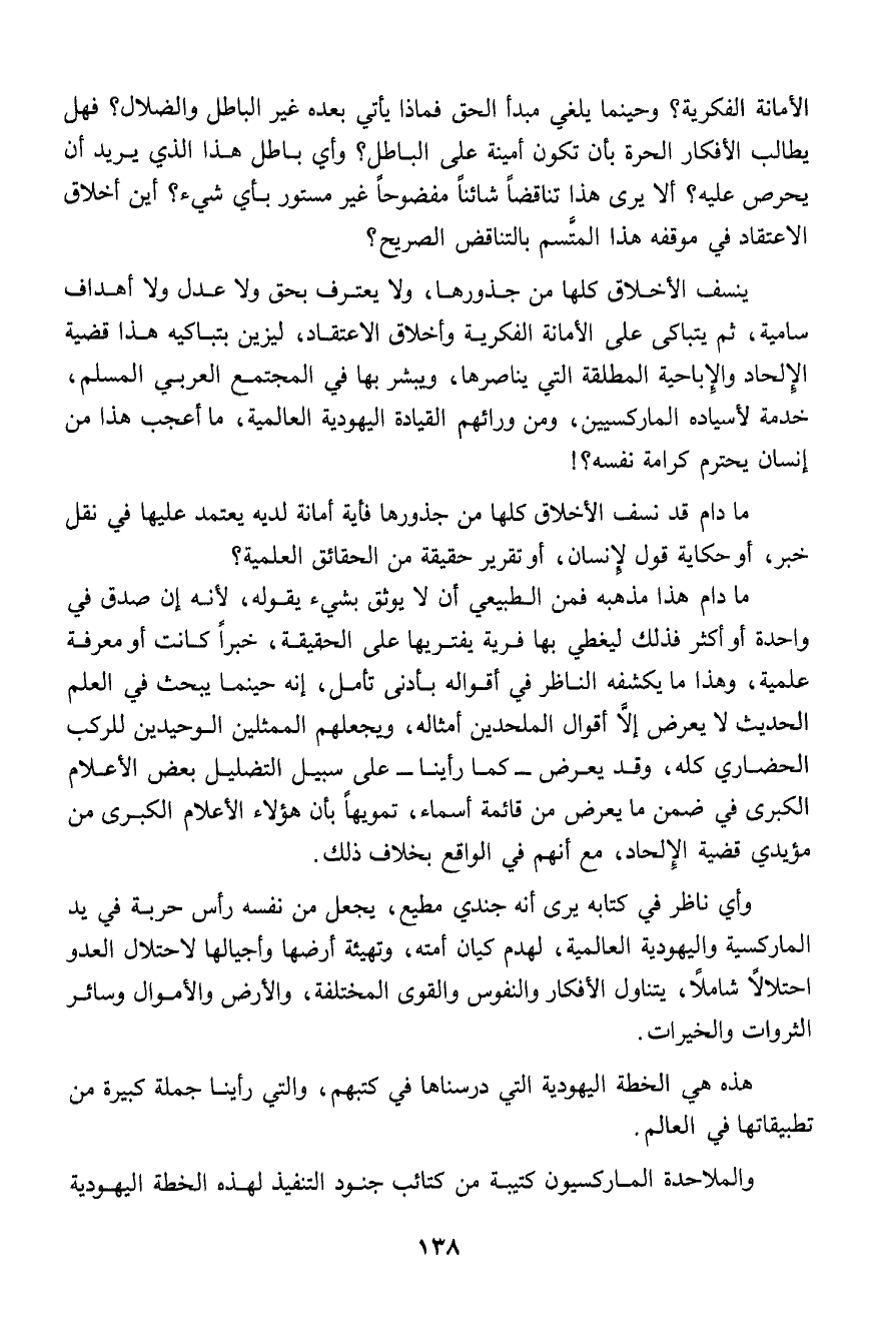 وأي ناظر في كتابه يرى أنه جندي مطيع، يجعل من نفسه رأسه حربة في يد الماركسية واليهودية العالمية، لهدم كيان أمته، وتهيئة أرضها وأجيالها لاحتلال العدو احتلالاً شاملاً، يتناول الأفكار والنفوس والقوى المختلفة، والأرض والأموال وسائر الثروات والخيرات.