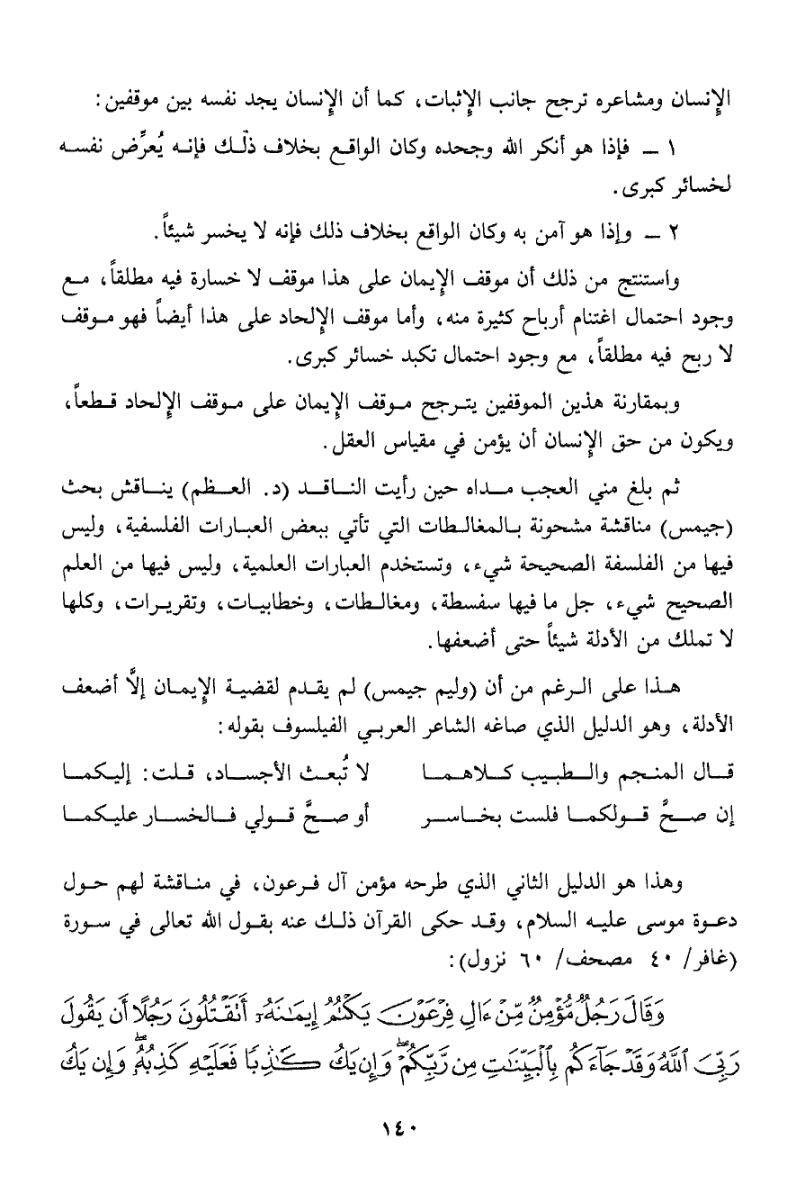 هذا على الرغم من أن (وليم جيمس) لم يقدم لقضية الإيمان إلا أضعف الأدلة، وهو الدليل الذي صاغه الشاعر العربي الفيلسوف بقوله: