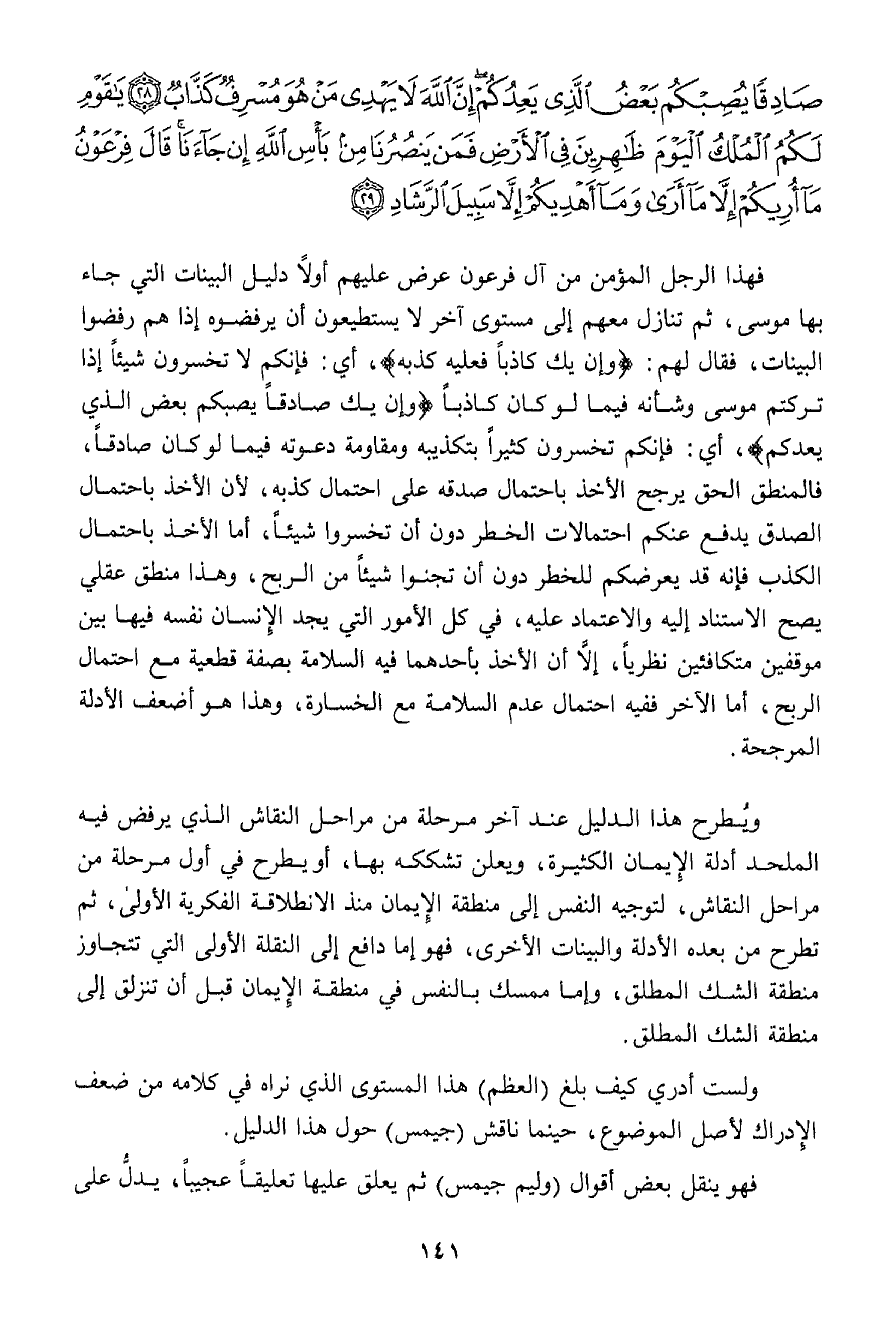 فهذا الرجل المؤمن من آل فرعون عرض عليهم أولاً دليل البينات التي جاء بها موسى، ثم تنازل معهم إلى مستوى آخر لا يستطيعون أن يرفضوه إذا هم رفضوا البينات، فقال لهم {وإن يك كاذباً فعليه كذبه} ، أي: فإنكم لا تخسرون شيئاً إذا تركتم موسى وشأنه فيما لو كان كاذباً {وإن يك صادقاً يصبكم بعض الذي يعدكم} ، أي: فإنكم تخسرون كثيراً بتكذيبه ومقاومة دعوته فيما لو كان صادقاً، فالمنطق الحق يرجح الأخذ باحتمال صدقه على احتمال كذبه، لأن الأخذ باحتمال الصدق يدفع عنكم احتمالات الخطر دون أن تخسروا شيئاً، أما الأخذ باحتمال الكذب فإنه قد يعرضكم للخطر دون أن تخسروا شيئاً، أما الأخذ باحتمال الكذب فإنه قد يعرضكم للخطر دون أن تجنوا شيئاً من الربح، وهذا منطق عقلي يصح الاستناد إليه والاعتماد عليه، في كل الأمور التي يجد الإنسان نفسه فيها بين موقفين متكافئين نظرياً، إلا أن الأخذ بأحدهما فيه السلامة بصفة قطعية مع احتمال الربح، أما الآخر ففيه احتمال عدم السلامة مع الخسارة، وهذا هو أضعف الأدلة المرجحة.