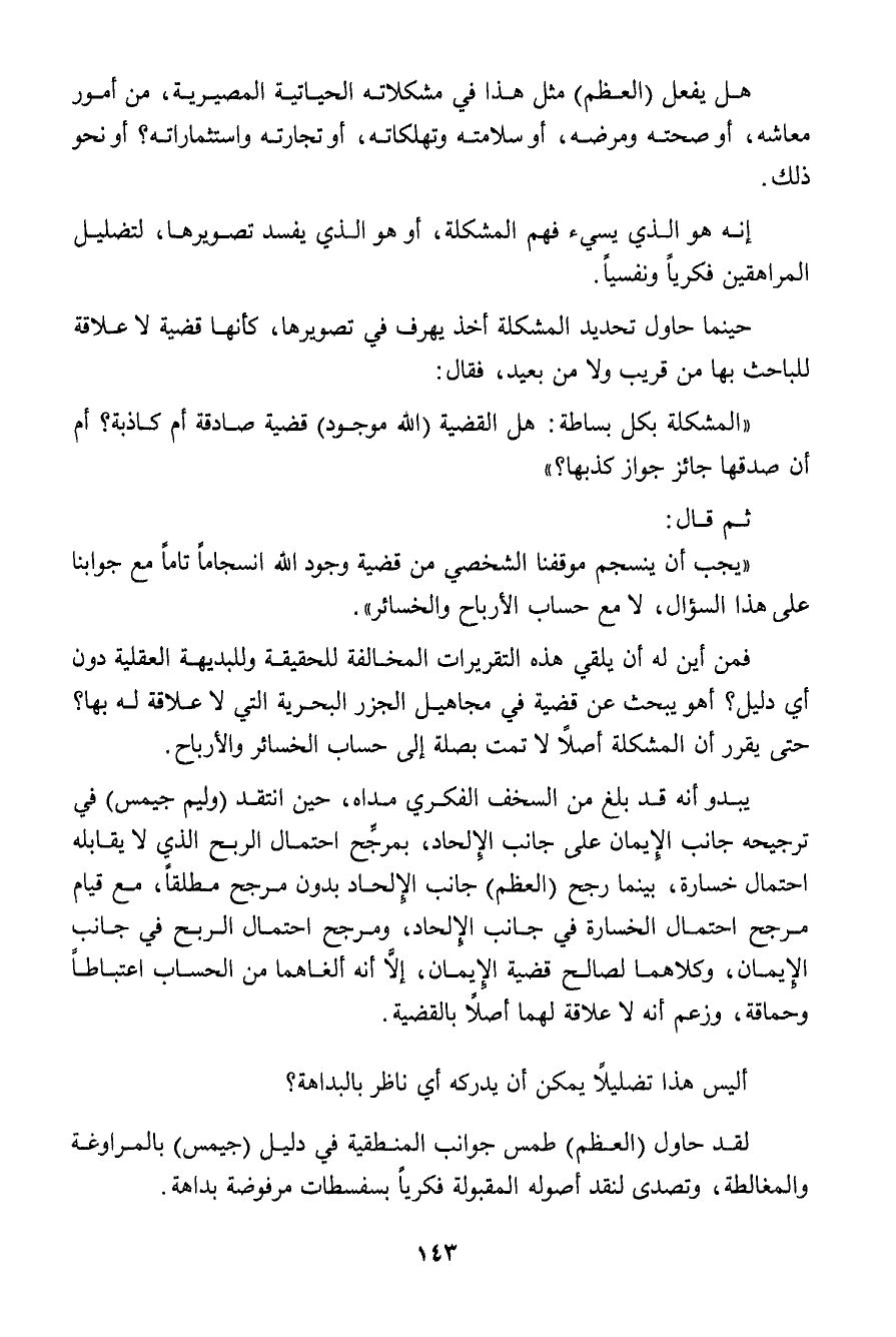 "يجب أن ينسجم موقفنا الشخصي من قضية وجود الله انسجاماً تاماً مع جوابنا على هذا السؤال، لا مع حساب الأرباح والخسائر".