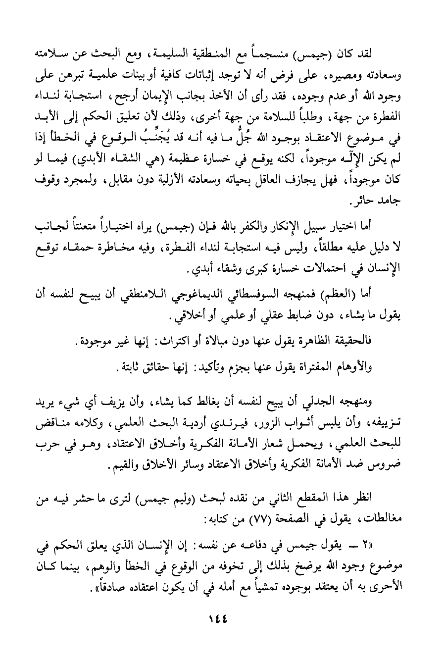 "2- يقول جيمس في دفاعه عن نفسه: إن الإنسان الذي يعلق الحكم في موضوع وجود الله يرضخ بذلك إلى تخوفه من الوقوع في الخطأ والوهم، بينما كان الأحرى به أن يعتقد بوجوده تمشياً مع أمله في أن يكون اعتقاده صادقاً".