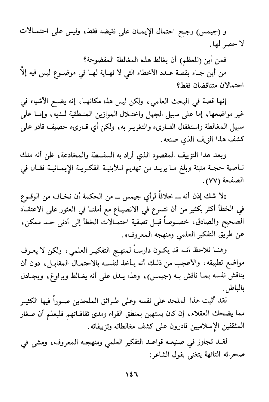 وهنا نلاحظ أنه قد يكون دارساً لمنهج التفكير العلمي، ولكن لا يعرف مواضع تطبيقه، والأعجب من ذلك أنه يأخذ لنفسه بالاحتمال المقابل، دون أن يناقش نفسه بما ناقش به (جيمس) ، وهذا يدل على أنه يغالط ويراوغ، ويجادل بالباطل.