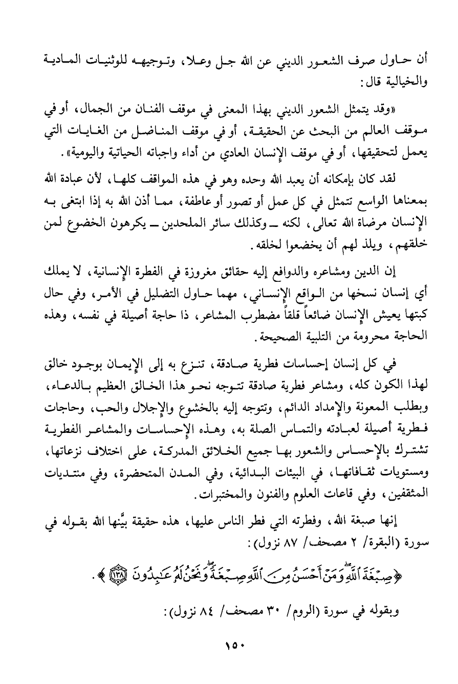 في كل إنسان إحساسات فطرية صادقة، تنزع به إلى الإيمان بوجود خالق لهذا الكون كله، ومشاعر فطرية صادقة تتوجه نحو هذا الخالق العظيم بالدعاء، وبطلب المعونة والإمداد الدائم، وتتوجه إليه بالخشوع والإجلال والحب، وحاجات فطرية أصيلة لعبادته والتماس الصلة به، وهذه الإحساسات والمشاعر الفطرية تشترك بالإحساس والشعور بها جميع الخلائق المدركة، على اختلاف نزعاتها، ومستويات ثقافاتها، في البيئات البدائية، وفي المدن المتحضرة، وفي منتديات المثقفين، وفي قاعات العلوم والفنون والمختبرات.