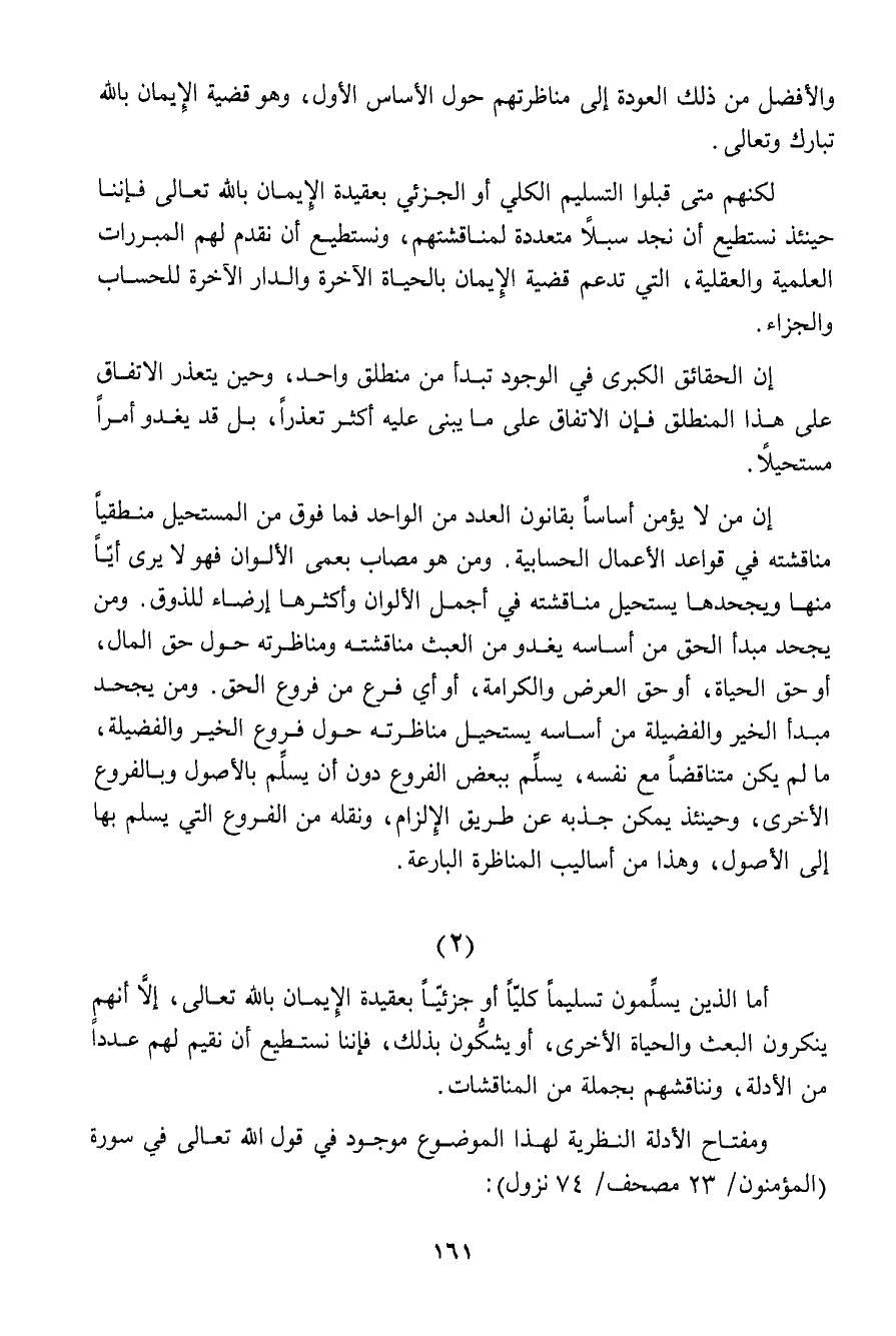والأفضل من ذلك العودة إلى مناظرتهم حول الأساس الأول، وهو قضية الإيمان بالله تبارك وتعالى.