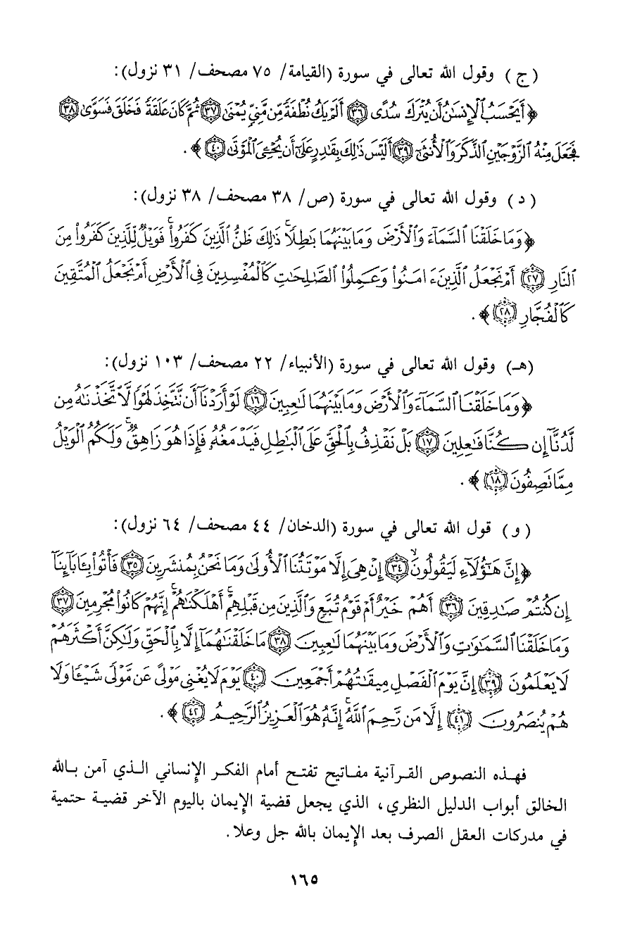 فهذه النصوص القرآنية مفاتيح تفتح أمام الفكر الإنساني الذي آمن بالله الخالق أبواب الدليل النظري، الذي يجعل قضية الإيمان باليوم الآخر قضية حتمية في مدركات العقل الصرف بعد الإيمان بالله جلَّ وعلا.