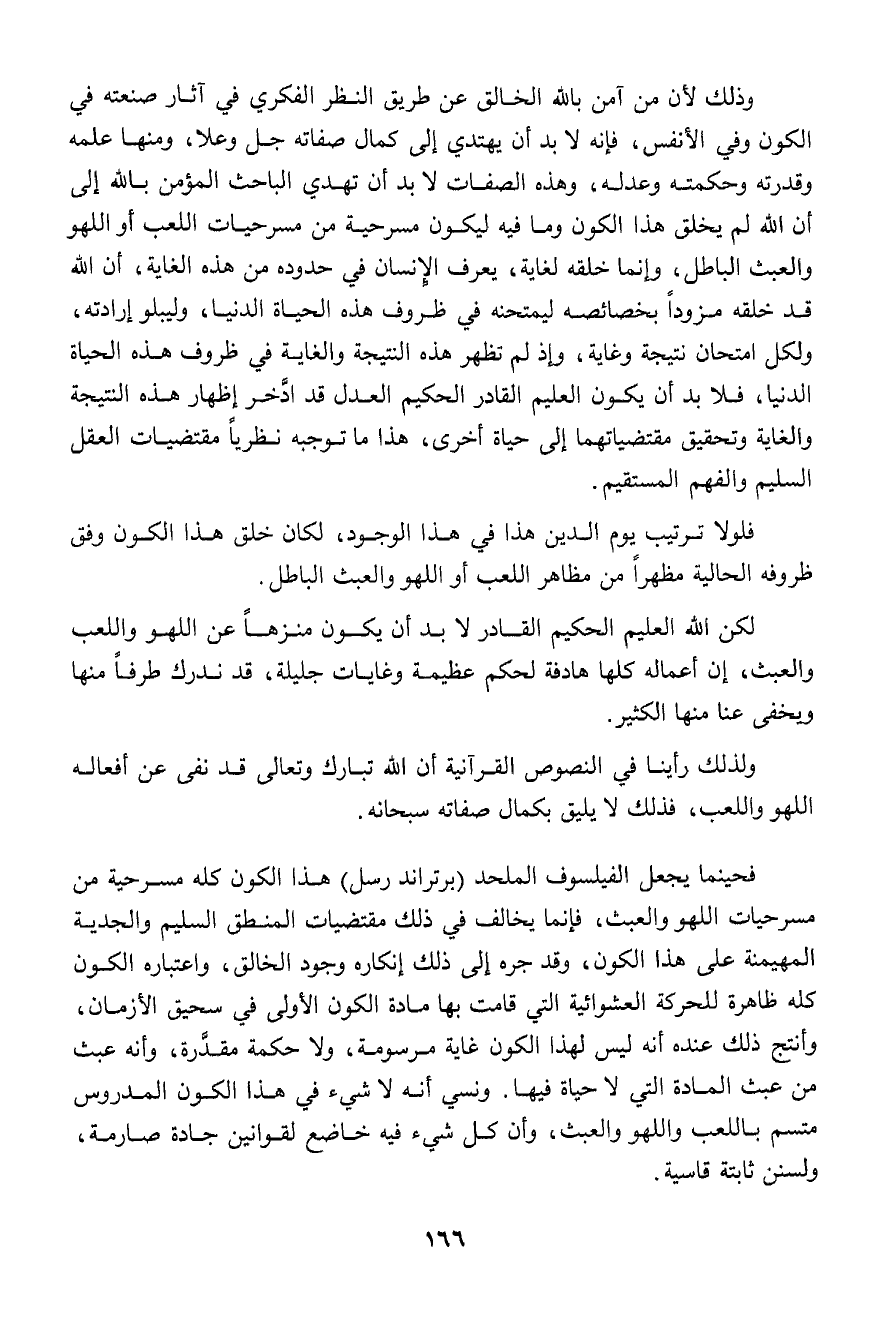 فحينما يجعل الفيلسوف الملحد (برتراند رسل) هذا الكون كله مسرحية من مسرحيات اللهو والعبث، فإنما يخالف في ذلك مقتضيات المنطق السليم والجدية المهيمنة على هذا الكون، وقد جره إلى ذلك إنكاره وجود الخالق، واعتباره الكون كله ظاهرة للحركة العشوائية التي قامت بها مادة الكون الأولى في سحيق الأزمان، وأنتج ذلك عنده أنه ليس لهذا الكون غاية مرسومة، ولا حكمة مقدَّرة، وأنه عبث من عبث المادة التي لا حياة فيها. ونسي أنه لا شيء في هذا الكون المدروس متسم باللعب واللهو والعبث، وأن كل شيء فيه خاضع لقوانين جادة صارمة، ولسنن ثابتة قاسية.