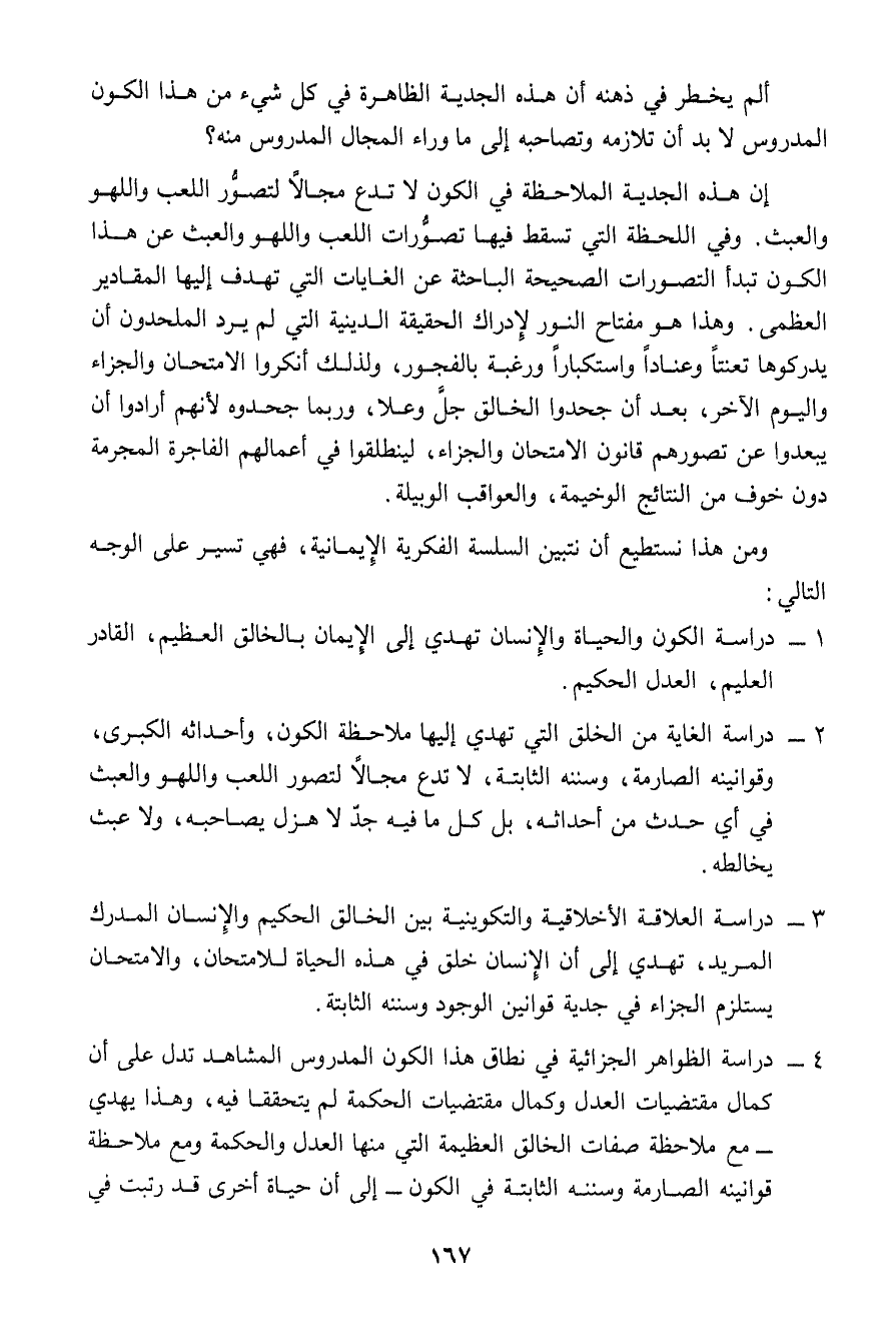 إن هذه الجدية الملاحظة في الكون لا تدع مجالاً لتصوُّر اللعب واللهو والعبث. وفي اللحظة التي تسقط فيها تصوُّرات اللعب واللهو والعبث عن هذا الكون تبدأ التصورات الصحيحة الباحثة عن الغايات التي تهدف إلهيا المقادير العظمى. وهذا هو مفتاح النور لإدراك الحقيقة الدينية التي لم يرد الملحدون أن يدركوها تعنتاً وعناداً واستكباراً ورغبة بالفجور، ولذلك أنكروا الامتحان والجزاء واليوم الآخر، بعد أن جحدوا الخالق جلَّ وعلا، وربما جحدوه لأنهم أرادوا أن يبعدوا عن تصورهم قانون الامتحان والجزاء، لينطلقوا في أعمالهم الفاجرة المجرمة دون خوف من النتائج الوخيمة، والعواقب الوبيلة.