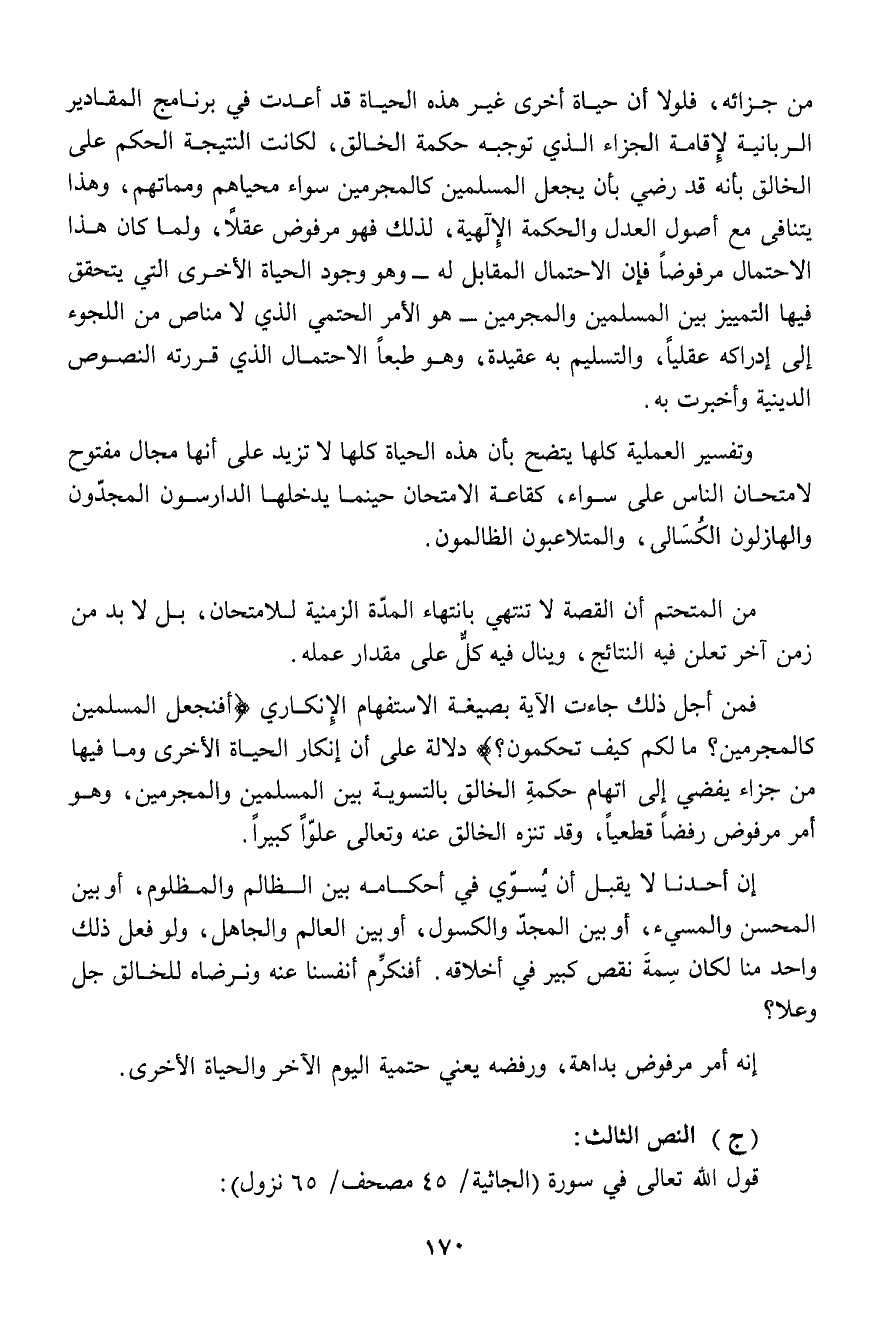 من جزائه، فلولا أن حياة أخرى غير هذه الحياة قد أعدت في برنامج المقادير الربانية لإقامة الجزاء الذي توجبه حكمة الخالق، لكانت النتيجة الحكم على الخالق بأنه قد رضي بأن يجعل المسلمين كالمجرمين سواء محياهم ومماتهم، وهذا يتنافى مع أصول العدل والحكمة الإلهية، لذلك فهو مرفوض عقلاً، ولما كان هذا الاحتمال مرفوضاً فإن الاحتمال المقابل له - وهو وجود الحياة الأخرى التي يتحقق فيها التمييز بين المسلمين والمجرمين - هو من الأمر الحتمي الذي لا مناص من اللجوء إلى إدراكه عقلاً، والتسليم به عقيدة، وهو طبعاً الاحتمال الذي قررته النصوص الدينية وأخبرت به.