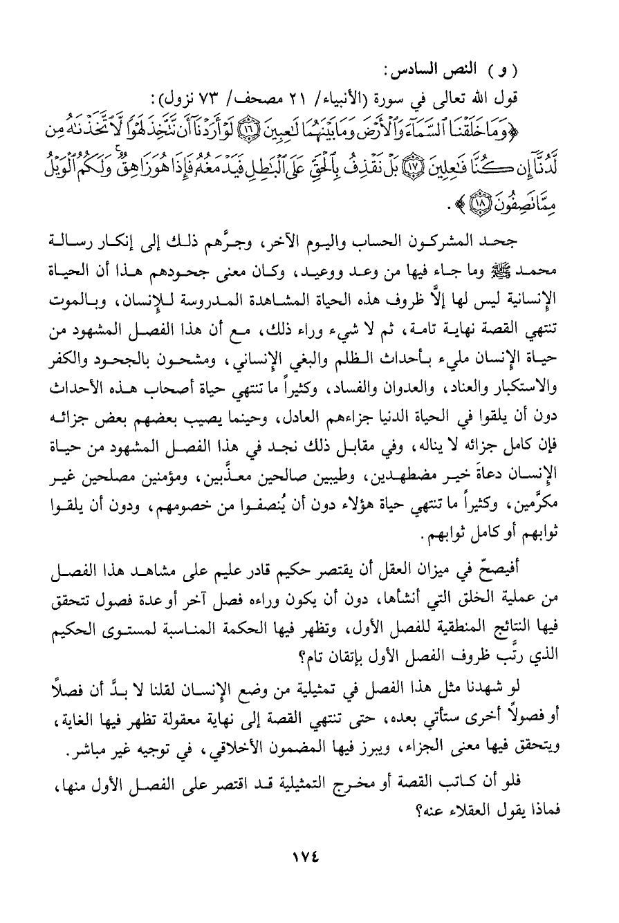 لو شهدنا مثل هذا الفصل في تمثيلية من وضع الإنسان لقلنا لا بدَّ أن فصلاً أو فصولاً أخرى ستأتي بعده، حتى تنتهي القصة إلى نهاية معقولة تظهر فيها الغاية، ويتحقق فهيا معنى الجزاء، ويبرز فيها المضمون الأخلاقي، في توجيه غير مباشر.