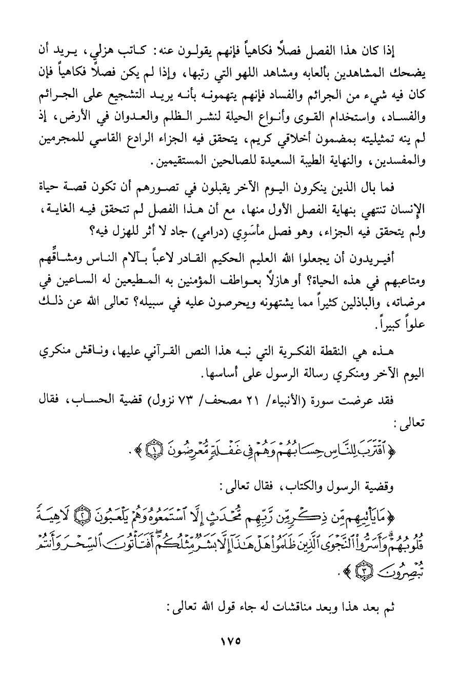 فما بال الذين ينكرون اليوم الآخر يقبلون في تصورهم أن تكون قصة حياة الإنسان تنتهي بنهاية الفصل الأول منها، مع أن هذا الفصل لم تتحقق فيه الغاية، ولم يتحقق فيه الجزاء , وهو فصل مأسَوِي (درامي) جاد لا أثر للهزل فيه؟