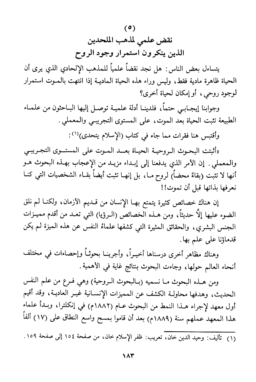 يتساءل بعض الناس: هل نجد نقضاً علمياً للمذهب الإلحادي الذي يرى أن الحياة ظاهرة مادية فقط، وليس وراء هذه الحياة المادية إذا انتهت بالموت استمرار لوجود روحي، أو إمكان لحياة أخرى؟
