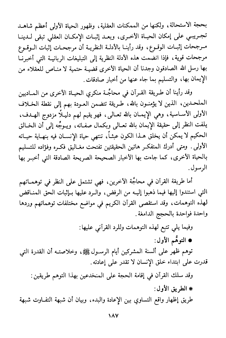 وقد رأينا أن طريقة القرآن في محاجَّة منكري الحياة الأخرى من الماديين الملحدين، الذين لا يؤمنون بالله، طريقة تتضمن العودة بهم إلى نقطة الخلاف الأولى الأساسية، وهي الإيمان بالله تعالى، فهو يقيم لهم دليلاً مزدوج الهدف، يلفت النظر إلى حقيقة الإيمان بالله تعالى وبكمال صفاته، ويوجِّه إلى أن الخالق الحكيم لا يمكن أن يخلق هذا الكون عبثاً، تنتهي حياة الإنسان فيه بنهاية حياته الأولى. ومتى أدرك المتفكر هاتين الحقيقتين تفتحت مغاليق فكره وفؤاده للتسليم بالحياة الأخرى، كما جاءت بها الأخبار الصحيحة الصريحة الصادقة التي أخبر بها الرسول.