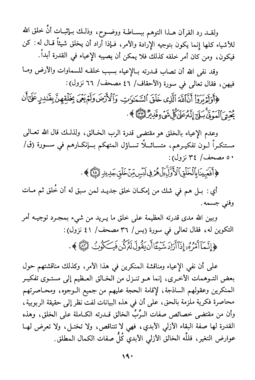 على أن نفي الإعياء ومناقشة المنكرين في هذا الأمر، وكذلك مناقشتهم حول بعض التوهمات الأخرى، إنما هو تنزل من الخالق العظيم إلى مستوى تفكير المنكرين وعقولهم الساذجة، لإقامة الحجة عليهم من جميع الوجوه، ومحاصرتهم محاصرة فكرية ملزمة بالحق، على أن في هذه البيانات لفت نظر إلى حقيقة الربوبية، وأن من مقتضى خصائص صفات الربِّ الخالق قدرته الكاملة على الخلق، وهذه القدرة لها صفة البقاء الأزلي الأبدي، فهي لا تتناقص، ولا تختل، ولا تعرض لها عوارض التغير، فلله الخالق الأزلي الأبدي كلُّ صفات الكمال المطلق.