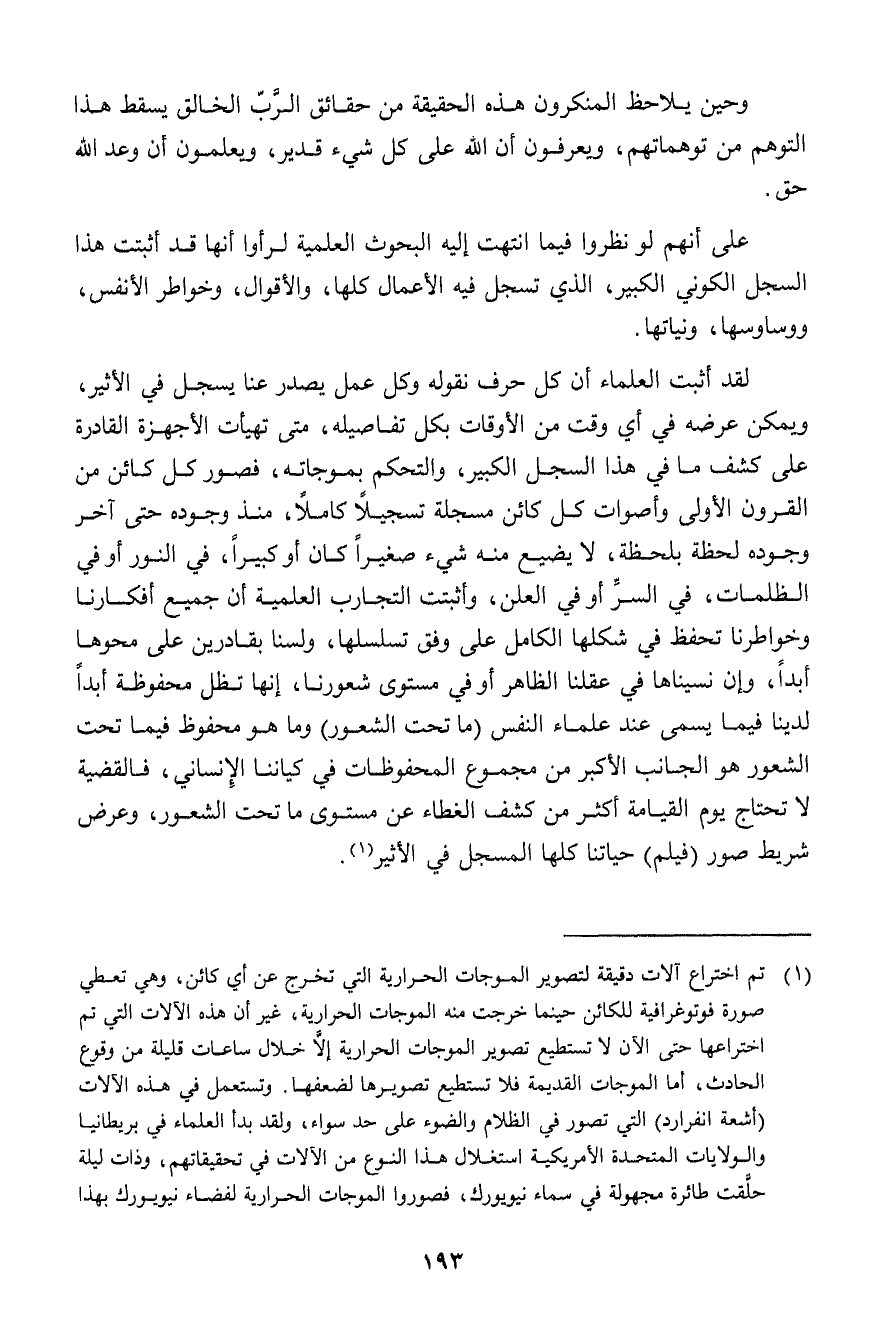 لقد أثبت العلماء أن كل حرف نقوله وكل عمل يصدر عنا يسجل في الأثير، ويمكن عرضه في أي وقت من الأوقات بكل تفاصيله، متى تهيأت الأجهزة القادرة على كشف ما في هذا السجل الكبير، والتحكم بموجاته، فصور كل كائن من القرون الأولى وأصوات كل كائن مسجلة تسجيلاً كاملاً، منذ وجوده حتى آخر وجوده لحظة بلحظة، لا يضيع منه شيء صغيراً كان أو كبيراً، في النور أو في الظلمات، في السرِّ أو في العلن، وأثبتت التجارب العلمية أن جميع أفكارنا وخواطرنا تحفظ في شكلها الكامل وفق تسلسلها، ولسنا بقادرين على محوها أبداً، وإن نسيناها في عقلنا الظاهر أو في مستوى شعورنا، إنها تظل محفوظة أبداً لدينا فيما يسمى عند علماء النفس (ما تحت الشعور) وما هو محفوظ فيما تحت الشعور هو الجانب الأكبر من مجموع المحفوظات في كياننا الإنساني، فالقضية لا تحتاج يوم القيامة أكثر من كشف الغطاء عن مستوى ما تحت الشعور، وعرض شريط صور (فيلم) حياتنا كلها المسجل في الأثير (¬1) .