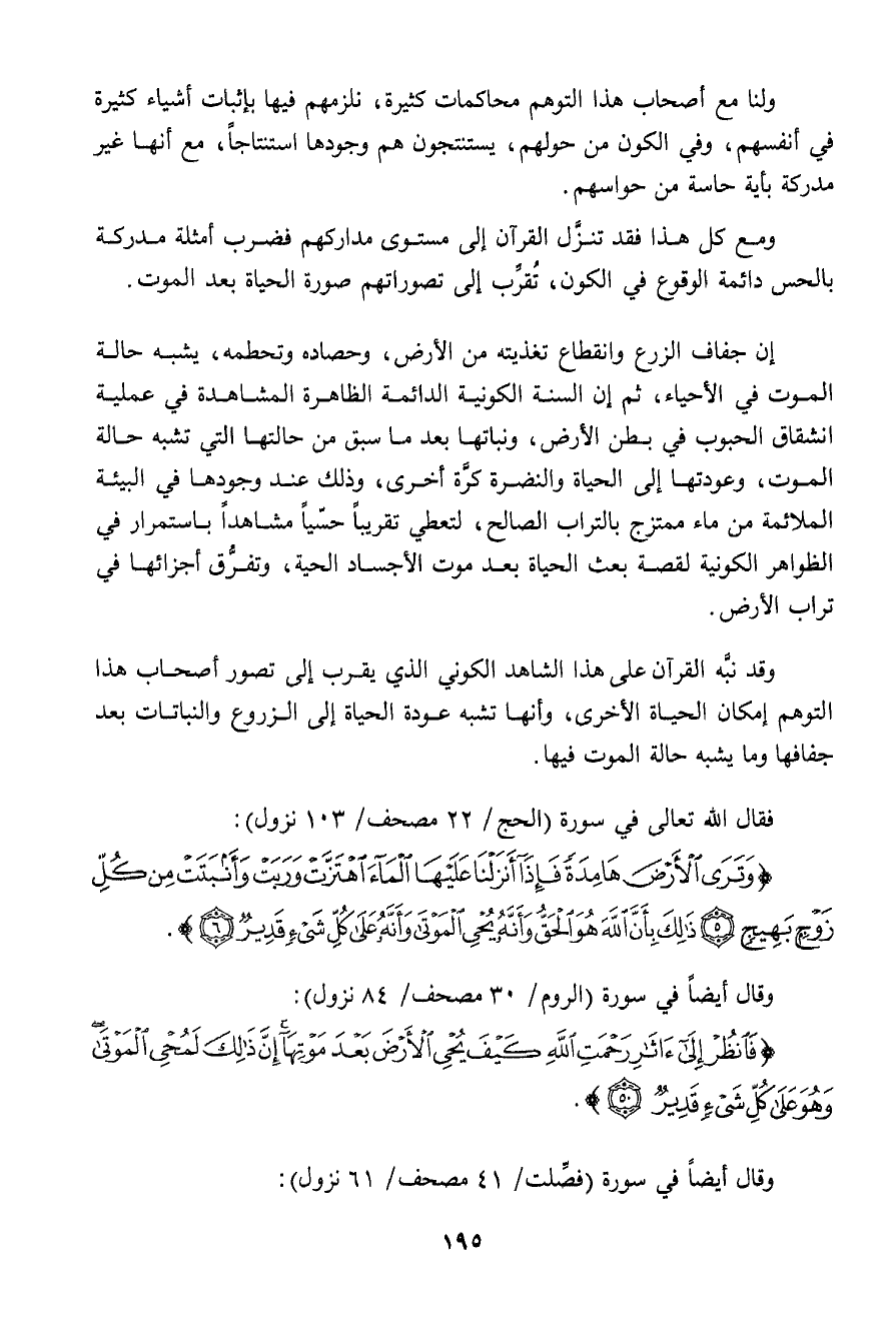 وقد نبَّه القرآن على هذا الشاهد الكوني الذي يقرب إلى تصور أصحاب هذا التوهم إمكان الحياة الأخرى، وأنها تشبه عودة الحياة إلى الزروع والنباتات بعد جفافها وما يشبه حالة الموت فيها.