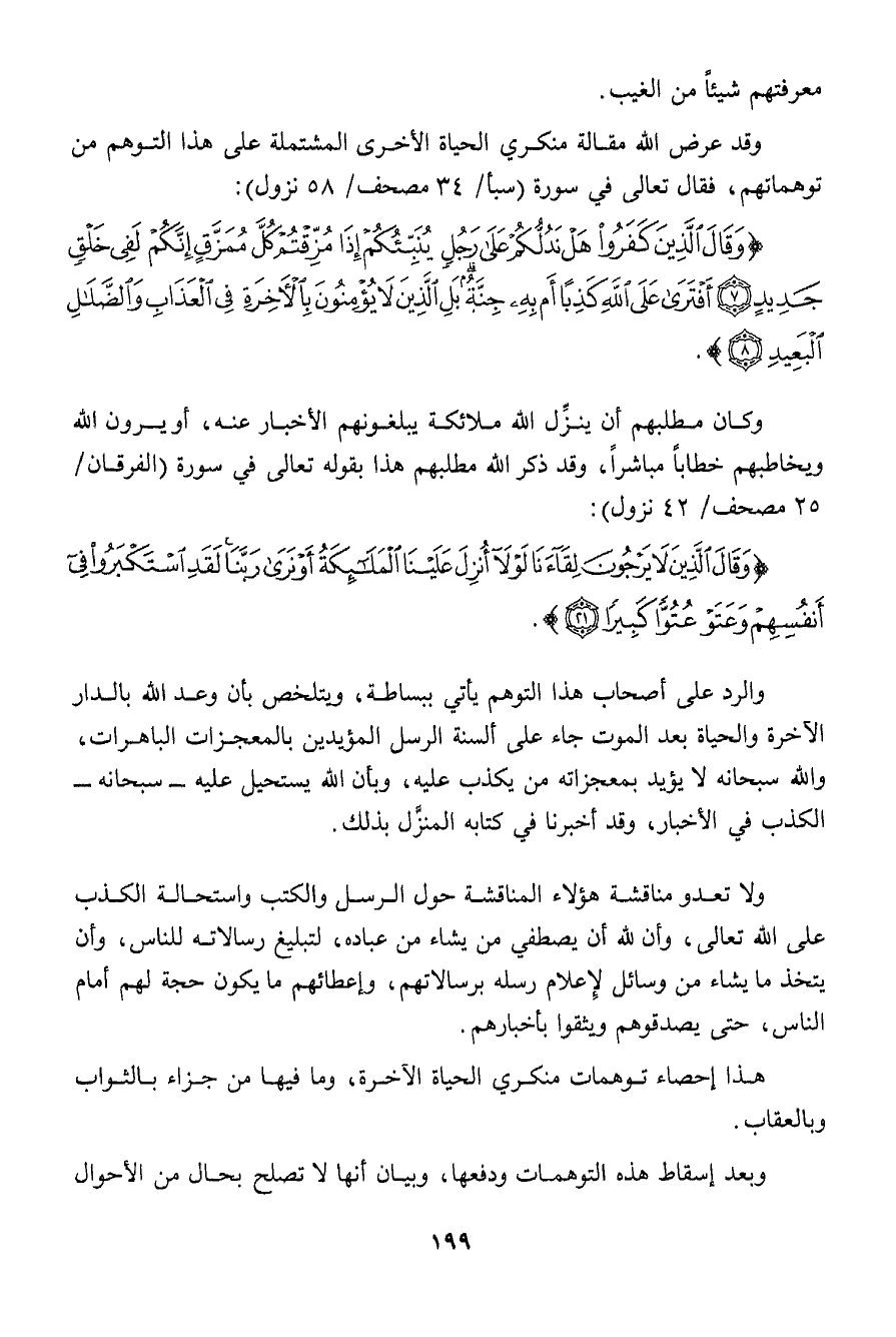 {وَقَالَ الَّذِينَ كَفَرُواْ هَلْ نَدُلُّكُمْ عَلَى رَجُلٍ يُنَبِّئُكُمْ إِذَا مُزِّقْتُمْ كُلَّ مُمَزَّقٍ إِنَّكُمْ لَفِي خَلْقٍ جَدِيدٍ * أَفْتَرَى عَلَى اللَّهِ كَذِباً أَم بِهِ جِنَّةٌ بَلِ الَّذِينَ لاَ يُؤْمِنُونَ بِالآخِرَةِ فِي الْعَذَابِ وَالضَّلاَلِ الْبَعِيدِ}