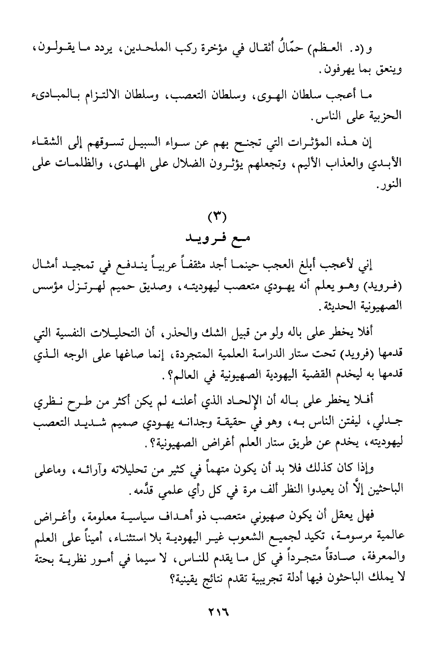 إني لأعجب أبلغ العجب حينما أجد مثقفاً عربياً يندفع في تمجيد أمثال (فرويد) وهو يعلم أنه يهودي متعصب ليهوديته، وصديق حميم لهرتزل مؤسس الصهيونية الحديثة.