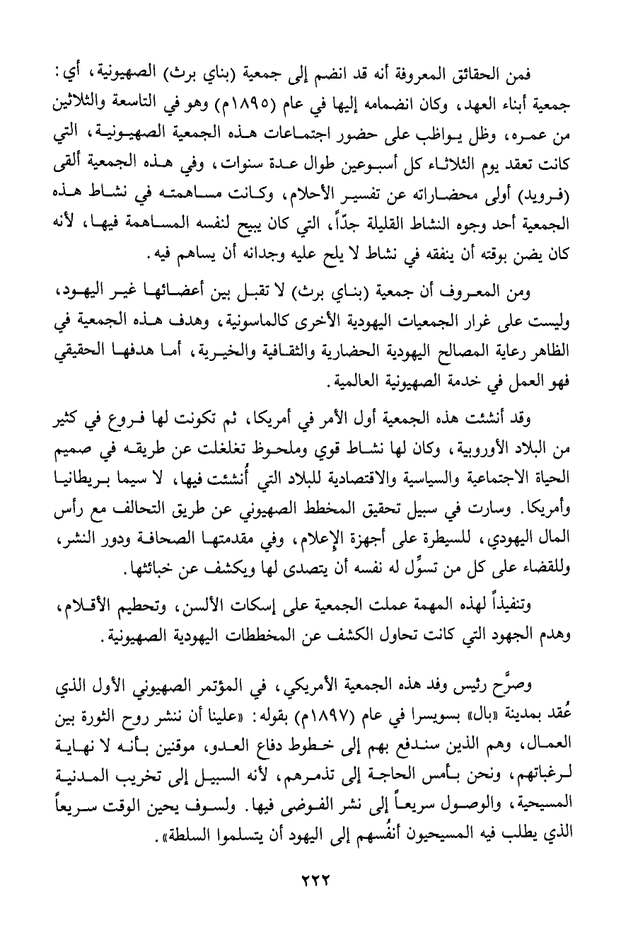 وصرح رئيس وفد هذه الجمعية الأمريكي، في المؤتمر الصهيوني الأول الذي عُقد بمدينة "بال" بسويسرا في عام (1897م) بقوله: "علينا أن ننشر روح الثورة بين العمال، وهم الذين سندفع بهم إلى خطوط دفاع العدو، موقنين بأنه لا نهاية لرغباتهم، ونحن بأمس الحاجة إلى تذمرهم، لأنه السبيل إلى تخريب المدنية المسيحية، والوصول سريعاً إلى نشر الفوضى فيها. ولسوف يحين الوقت سريعاً الذي يطلب فيه المسيحيون أنفُسهم إلى اليهود أن يتسلموا السلطة".