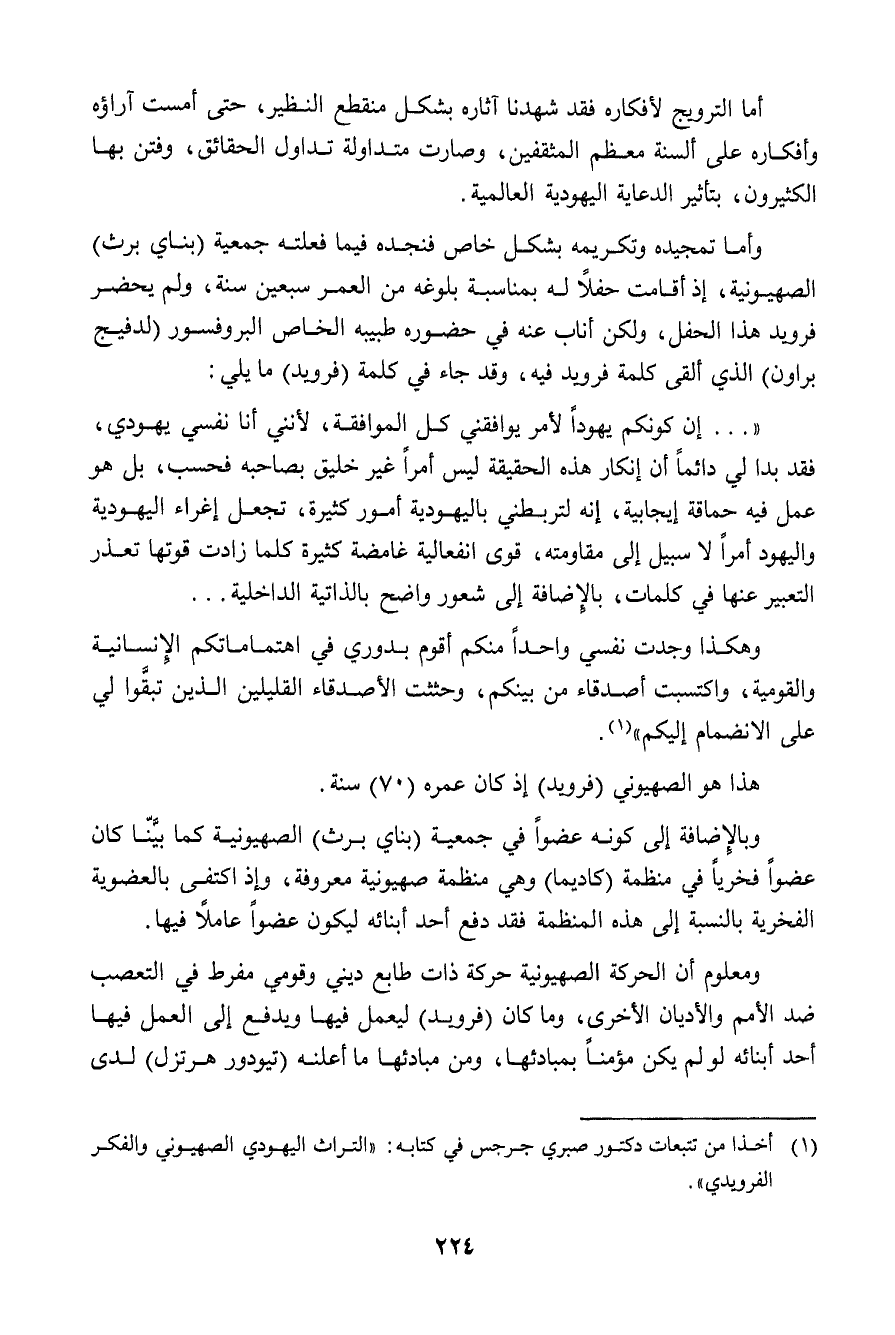ومعلوم أن الحركة الصهيونية حركة ذات طابع ديني وقومي مفرط في التعصب ضد الأمم والأديان الأخرى، وما كان (فرويد) ليعمل فيها ويدفع إلى العمل فيها أحد أبنائه لو لم يكن مؤمناً بمبادئها، ومن مبادئها ما أعلنه (تيودور هرتزل) لدى