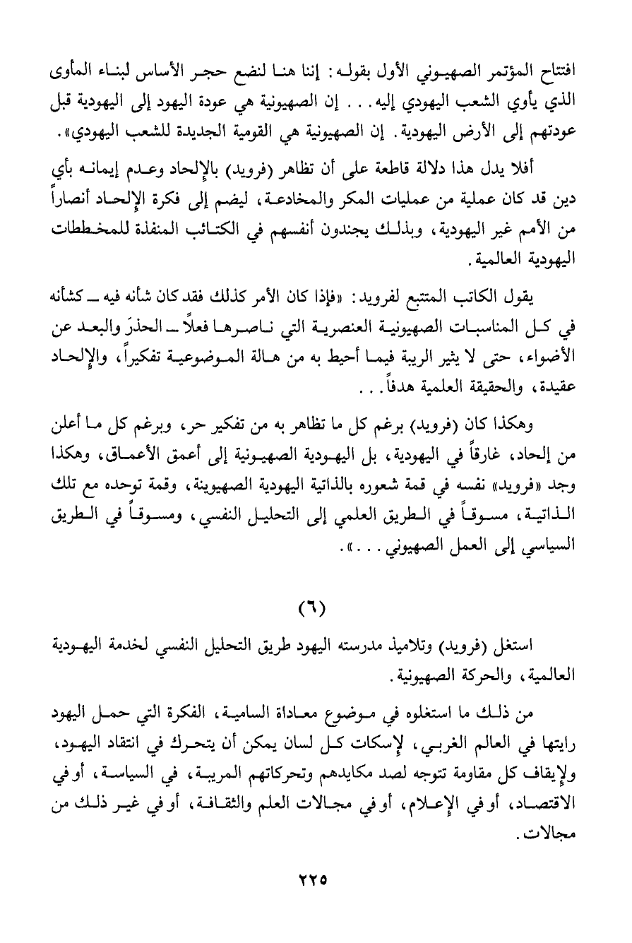 وهكذا كان (فرويد) برغم كل ما تظاهر به من تفكير حر، وبرغم كل ما أعلن من إلحاد، غارقاً في اليهودية، بل اليهودية الصهيونية إلى أعمق الأعماق، وهكذا وجد "فرويد" نفسه في قمة شعوره بالذاتية اليهودية الصهيونية، وقمة توحده مع تلك الذاتية، مسوقاً في الطريق العلمي إلى التحليل النفسي، ومسوقاً في الطريق السياسي إلى العمل الصهيوني ... ".