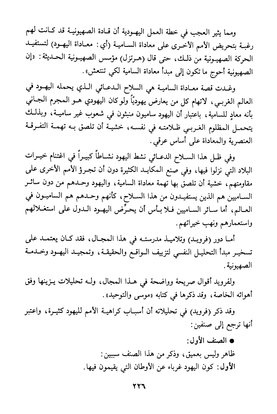 وفي ظل هذا السلاح الدعائي نشط اليهود نشاطاً كبيراً في اغتنام خيرات البلاد التي نزلوا فهيا، وفي صنع المكايد الكثيرة دون أن تجرؤ الأمم الأخرى على مقاومتهم، خشية أن تلصق بها تهمة معاداة السامية، واليهود وحدهم من دون سائر الساميين هم الذين يستفيدون من هذا السلاح، كأنهم وحدهم هم الساميون في العالم، أما سائر الساميين فلا بأس أن يحرضِّ اليهود الدول على استغلالهم واستعمارهم ونهب خيراتهم.