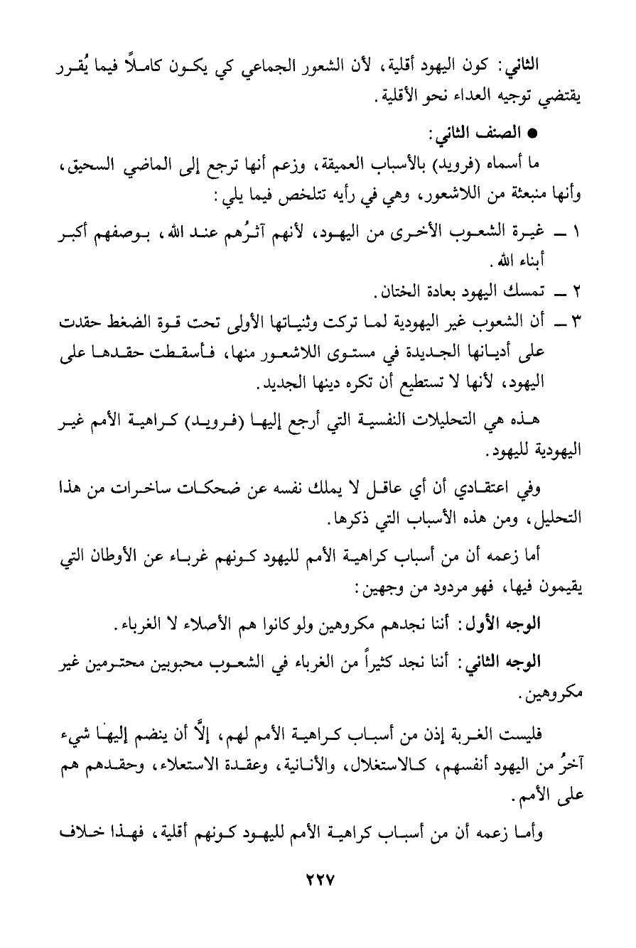 فليست الغربة إذن من أسباب كراهية الأمم لهم، إلا أن ينضم إليها شيء آخرُ من اليهود أنفسهم، كالاستغلال والأنانية وعقدة الاستعلاء وحقدهم هم على الأمم.