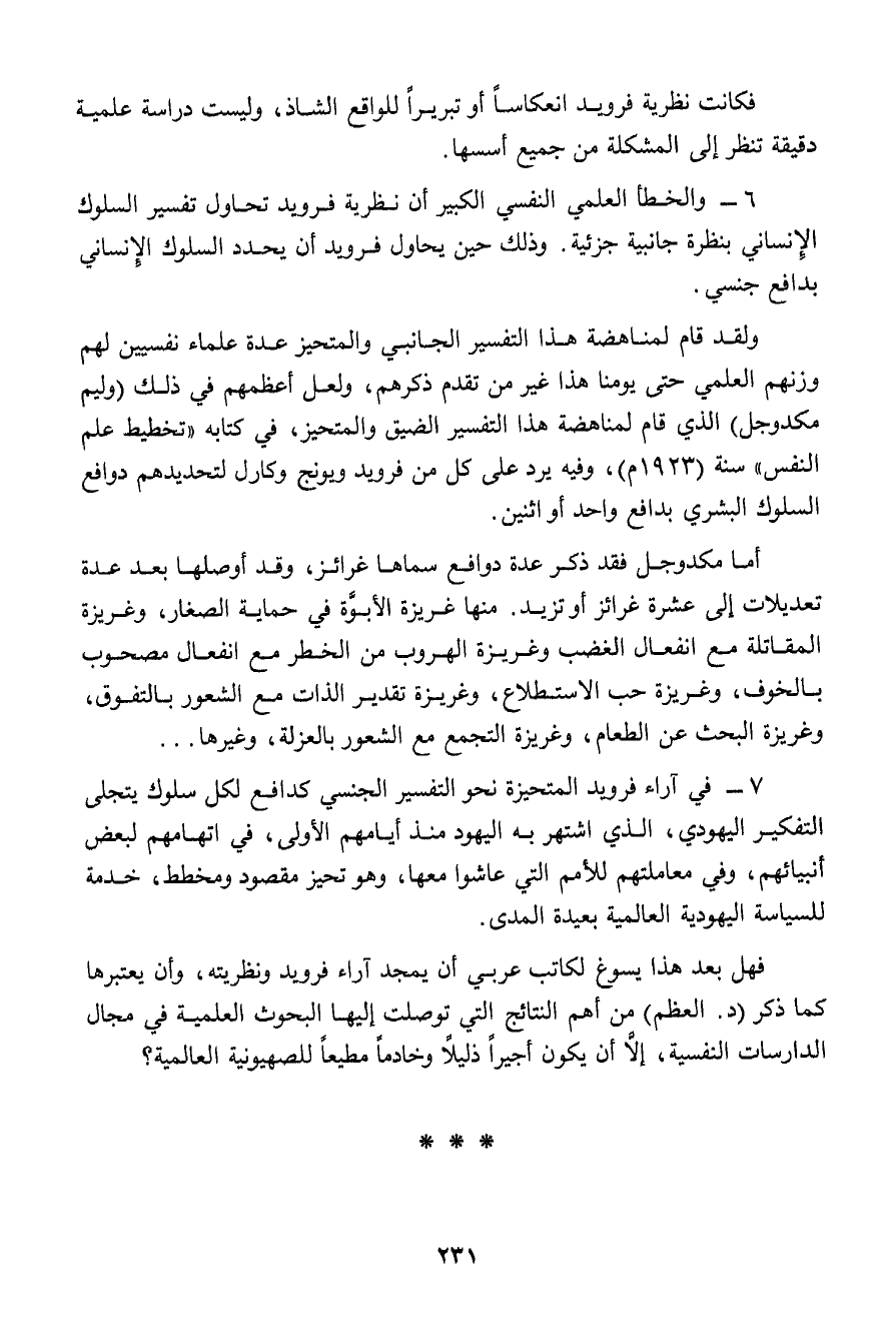 7- في آراء فرويد المتحيزة نحو التفسير الجنسي كدافع لكل سلوك يتجلى التفكير اليهودي، الذي اشتهر به اليهود منذ أيامهم الأولى، وفي اتهامهم لبعض أنبيائهم، وفي معاملتهم للأمم التي عاشوا معها، وهو تحيز مقصود ومخطط، خدمة للسياسة اليهودية العالمية بعيدة المدى.