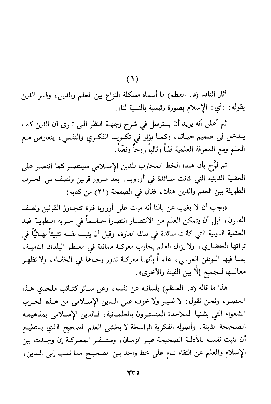 أثار الناقد (د. العظم) ما أسماه مشكلة النزاع بين العلم والدين، وفسر الدين بقوله: "أي: الإسلام بصورة رئيسية بالنسبة لنا".