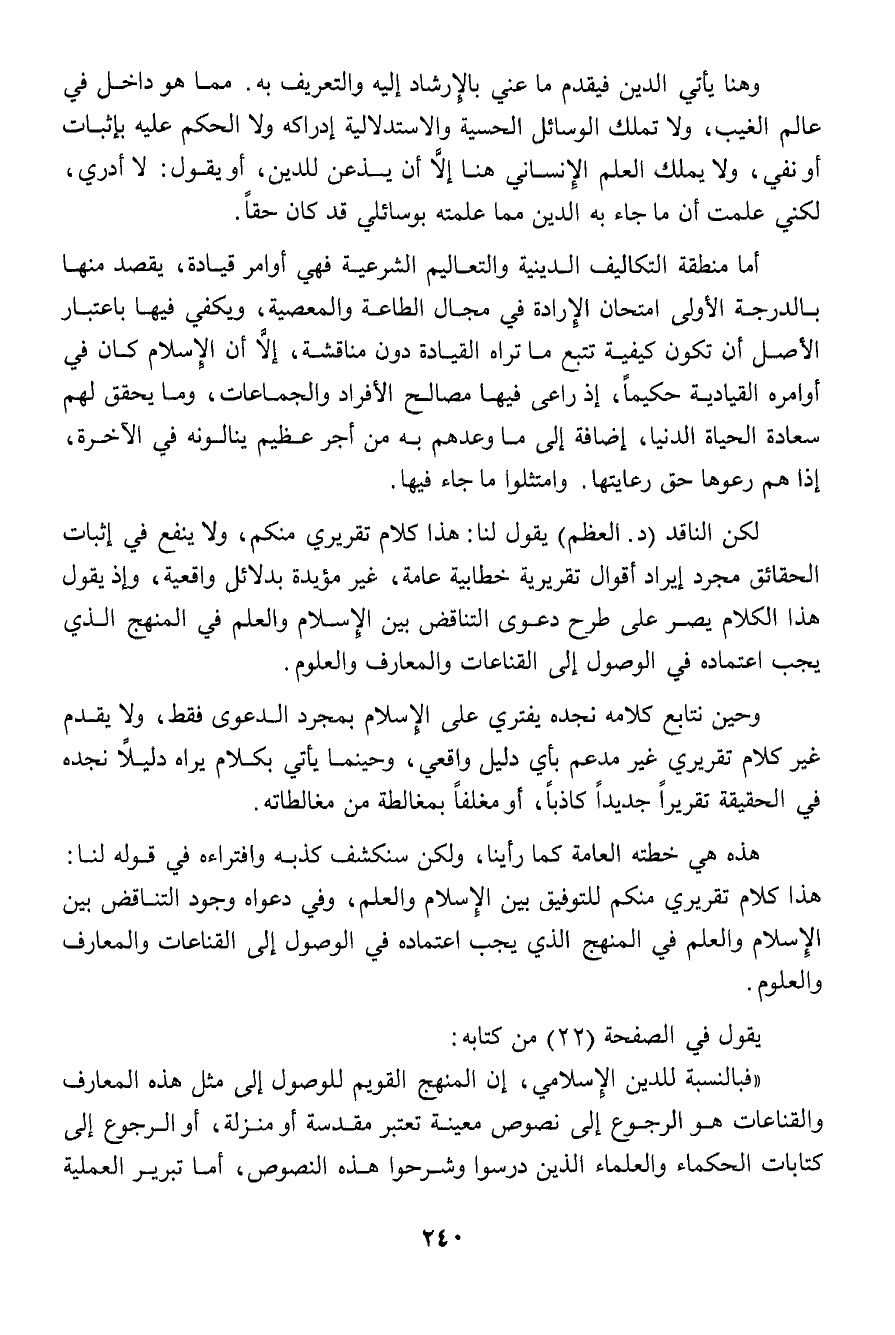 لكن الناقد (د. العظم) يقول لنا: هذا كلام تقريري منكم، ولا ينفع في إثبات الحقائق مجرد إيراد أقوال تقريرية خطابية عامة، غير مؤيدة بدلائل واقعية، وإذ يقول هذا الكلام يصر على طرح دعوى التناقض بين الإسلام والعلم في المنهج الذي يجب اعتماده في الوصول إلى القناعات والمعارف والعلوم.