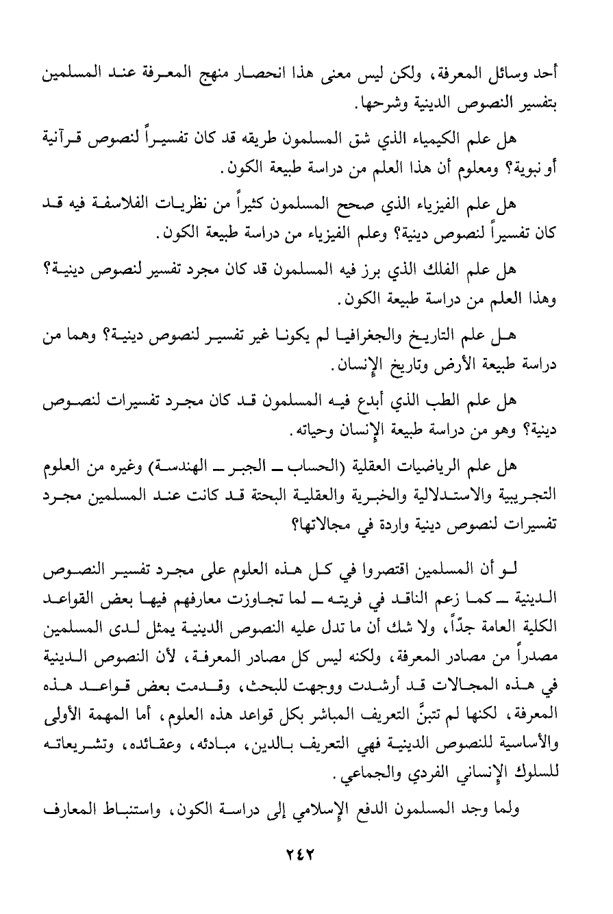 لو أن المسلمين اقتصروا في كل هذه العلوم على مجرد تفسير النصوص الدينية - كما زعم الناقد في فريته - لما تجاوزت معارفهم فيها بعض القواعد الكلية العامة جداً، ولا شك أن ما تدل عليه النصوص الدينية يمثل لدى المسلمين مصدراً من مصادر المعرفة، ولكنه ليس كل مصادر المعرفة، لأن النصوص الدينية في هذه المجالات قد أرشدت ووجهت للبحث، وقدمت بعض قواعد هذه المعرفة، لكنها لم تتبنَّ التعريف المباشر بكل قواعد هذه العلوم، أما المهمة الأولى والأساسية للنصوص الدينية فهي التعريف بالدين، مبادئه وعقائده وتشريعاته للسلوك الإنساني الفردي والجماعي.
