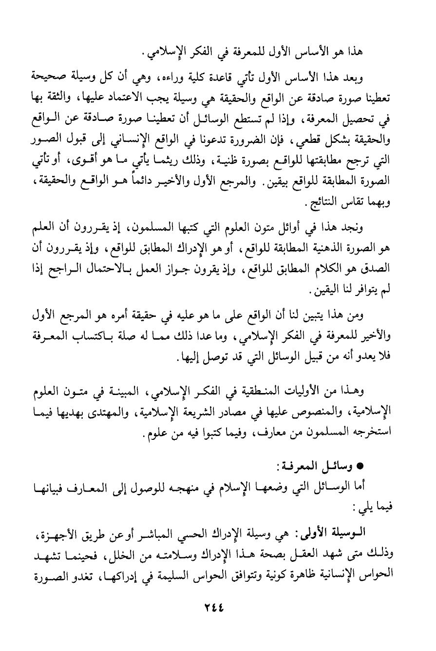 ومن هذا يتبين لنا أن الواقع على ما هو عليه في حقيقة أمره هو المرجع الأول والأخير للمعرفة في الفكر الإسلامي، وما عدا ذلك مما له صلة باكتساب المعرفة فلا يعدو أنه من قبيل الوسائل التي قد توصل إليها.
