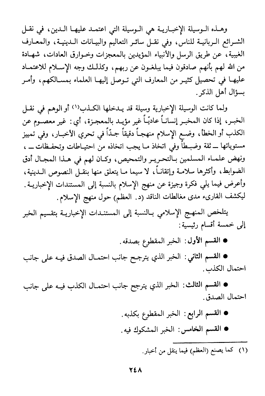 ولما كانت الوسيلة الإخبارية وسيلة قد يدخلها الكذب (¬1) أو الوهم في نقل الخبر، إذا كان المخبر إنساناً عادياً غير مؤيد بالمعجزة، أي: غير معصوم عن الكذب أو الخطأ، وضع الإسلام منهجاً دقيقاً جداً في تحري الأخبار، وفي تمييز مستوياتها - ثقة وضبطاً وفي اتخاذ ما يجب اتخاذه من احتياطات وتحفظات-، ونهض علماء المسلمين بالتحرير والتمحيص، وكان لهم في هذا المجال أدق الضوابط، وأكثرها سلامة وإتقاناً، لا سيما ما يتعلق منها بنقل النصوص الدينية، وأعرض فيما يلي فكرة وجيزة عن منهج الإسلام بالنسبة إلى المستندات الإخبارية. ليكشف القارئ مدى مغالطات الناقد (د. العظم) حول منهج الإسلام.