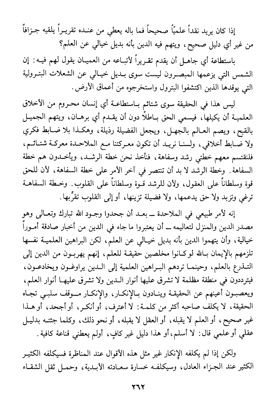 ليس هذا في الحقيقة سوى شتائم باستطاعة أي إنسان محروم من الأخلاق العلمية أن يكيلها، فيسمي الحق باطلاً دون أن يقدم أي برهان، ويتهم الجميل بالقبح، ويصم العالم بالجهل، ويجعل الفضيلة رذيلة، وهكذا بلا ضابط فكري ولا ضابط أخلاقي، ولسنا نريد أن تكون معركتنا مع الملاحدة معركة شتائم، فلنقتسم معهم خطتي رشد وسفاهة، فنأخذ نحن خطة الرشد، ويأخذون هم خطة السفاهة. وخطة الرشد لا بد أن تنتصر في آخر الأمر على خطة السفاهة، لأن للحق قوة وسلطاناً على العقول، ولأن للرشد قوة وسلطاناً على القلوب. وخطة السفاهة ترغي وتزبد ولا حق يدعمها، ولا فضيلة تزينها، أو إلى القلوب تقرِّبها.