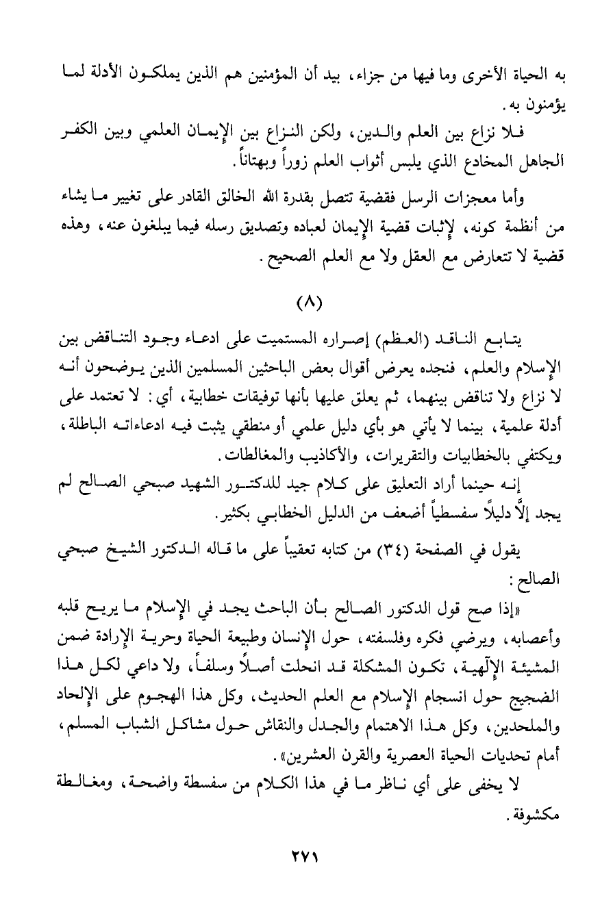 "إذا صح قول الدكتور الصالح بأن الباحث يجد في الإسلام ما يريح قلبه وأعصابه، ويرضي فكره وفلسفته، حول الإنسان وطبيعة الحياة وحرية الإرادة ضمن المشيئة الإلهية، تكون المشكلة قد انحلت أصلاً وسلفاً، ولا داعي لكل هذا الضجيج حول انسجام الإسلام مع العلم الحديث، وكل هذا الهجوم على الإلحاد والملحدين، وكل هذا الاهتمام والجدل والنقاش حول مشاكل الشباب المسلم، أمام تحديات الحياة العصرية والقرن العشرين".