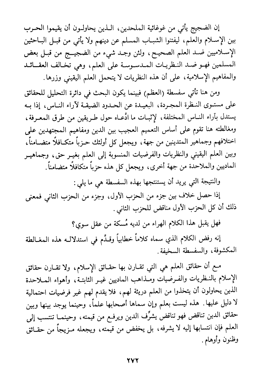 مع أن حقائق العلم هي التي تقارن بها حقائق الإسلام، ولا تقارن حقائق الإسلام بالنظريات والفرضيات ومذاهب الماديين غير الثابتة، وأهواء الملاحدة الذين يحاولون أن يتخذوا من العلم دريئة لهم، فلا يقدم لهم غير فرضيات احتمالية لا دليل عليها. هذه ليست بعلم وإن سماها أصحابها علماً، وحينما يوجد بينها وبين حقائق الدين تناقض فهو تناقض يشرف الدين ويرفع من قيمته، ويجعله مزيجاً من حقائق وظنون وأوهام.